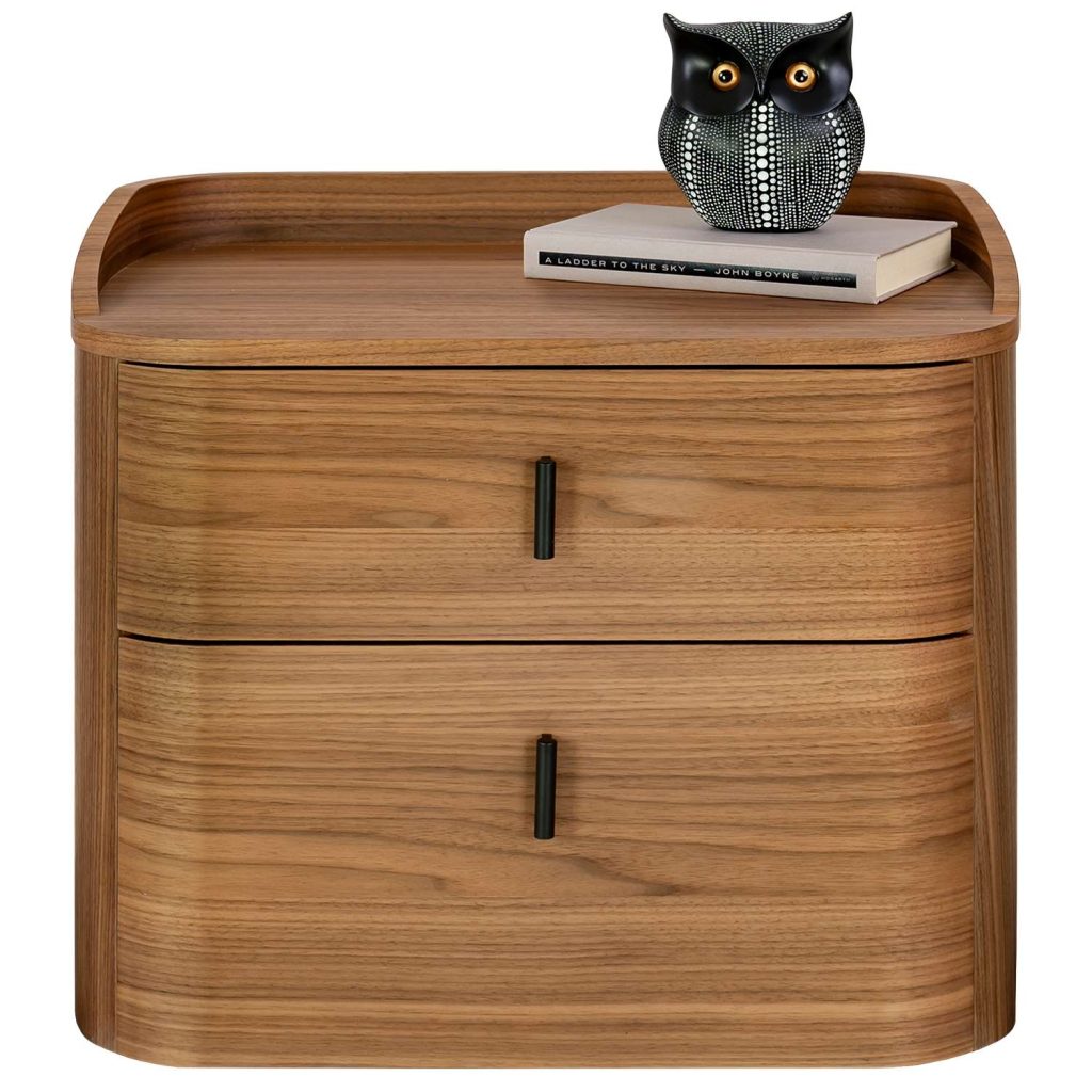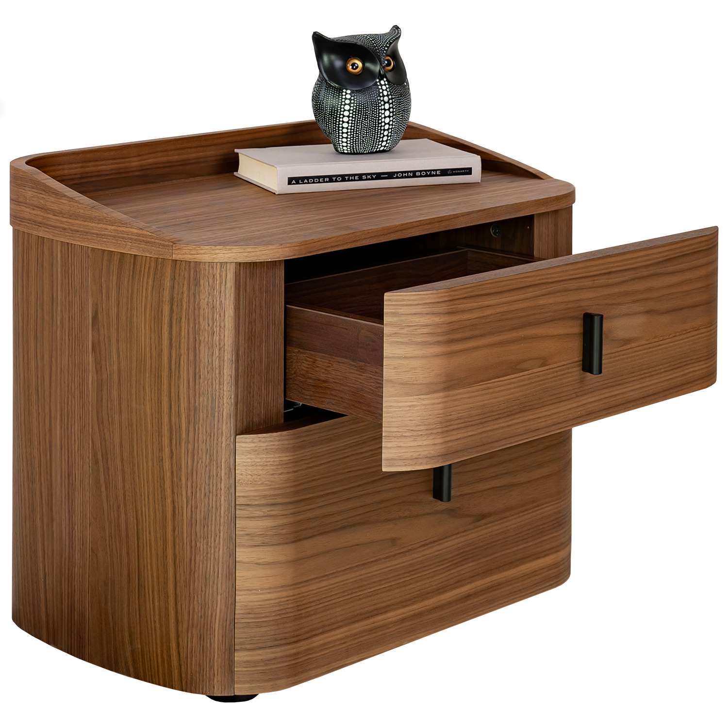 [0] => The Bradford Nightstand features a timeless, midcentury modern-inspired design with a classic walnut veneer and inviting rounded corners. Two soft-close drawers with black metal handles allow you to store bedside essentials, and a raised edge on the sides and back of the tabletop prevents items from rolling off. With its warm wood and thoughtful design, Bradford will add functional simplicity to any bedroom.