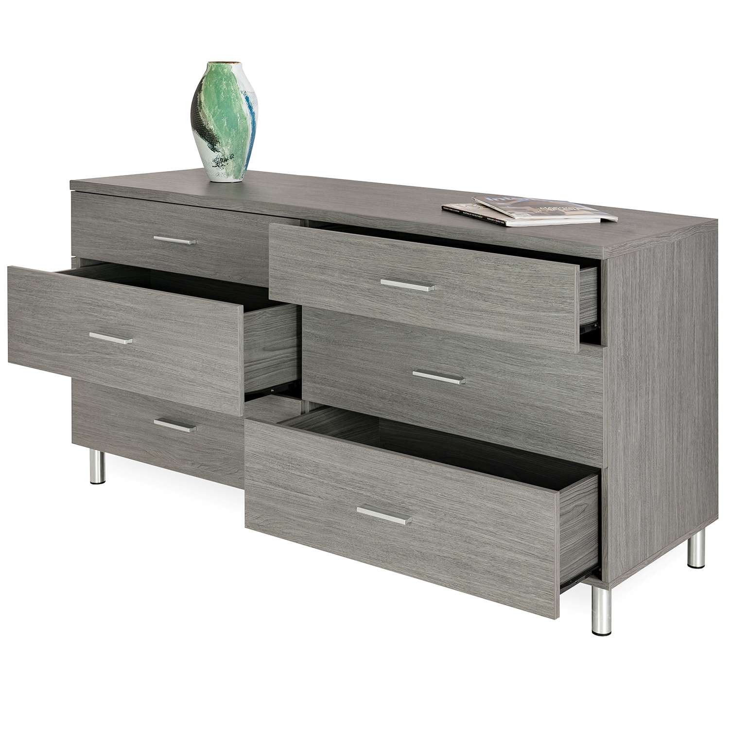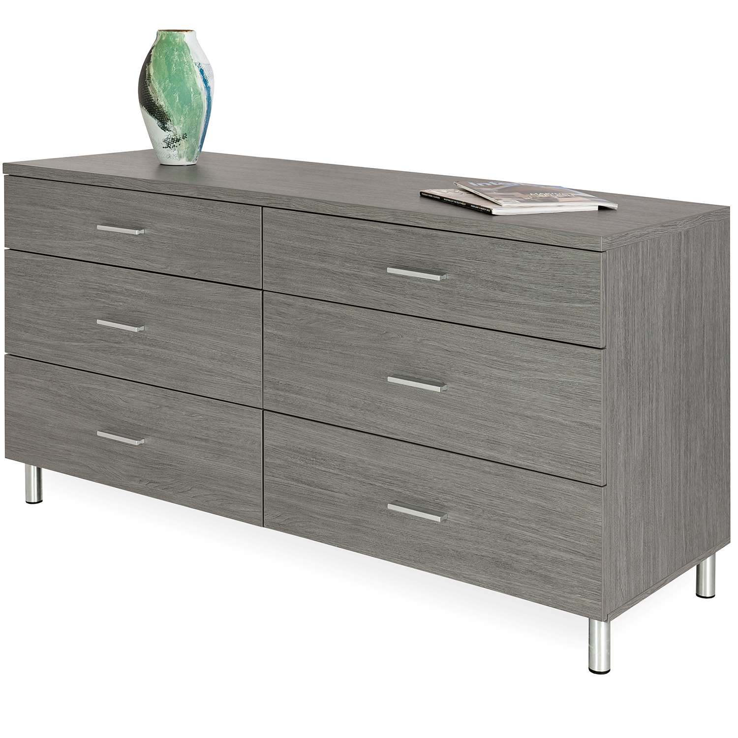 The Bravo Double Dresser features volcanic ash melamine with matching metal handles and legs. The melamine is textured to resemble real wood and the handles are minimalist and sturdy. Six spacious drawers ensure you have ample storage space for your clothes and accessories. Pair this dresser with the rest of the Bravo bedroom set for a truly modern look.
