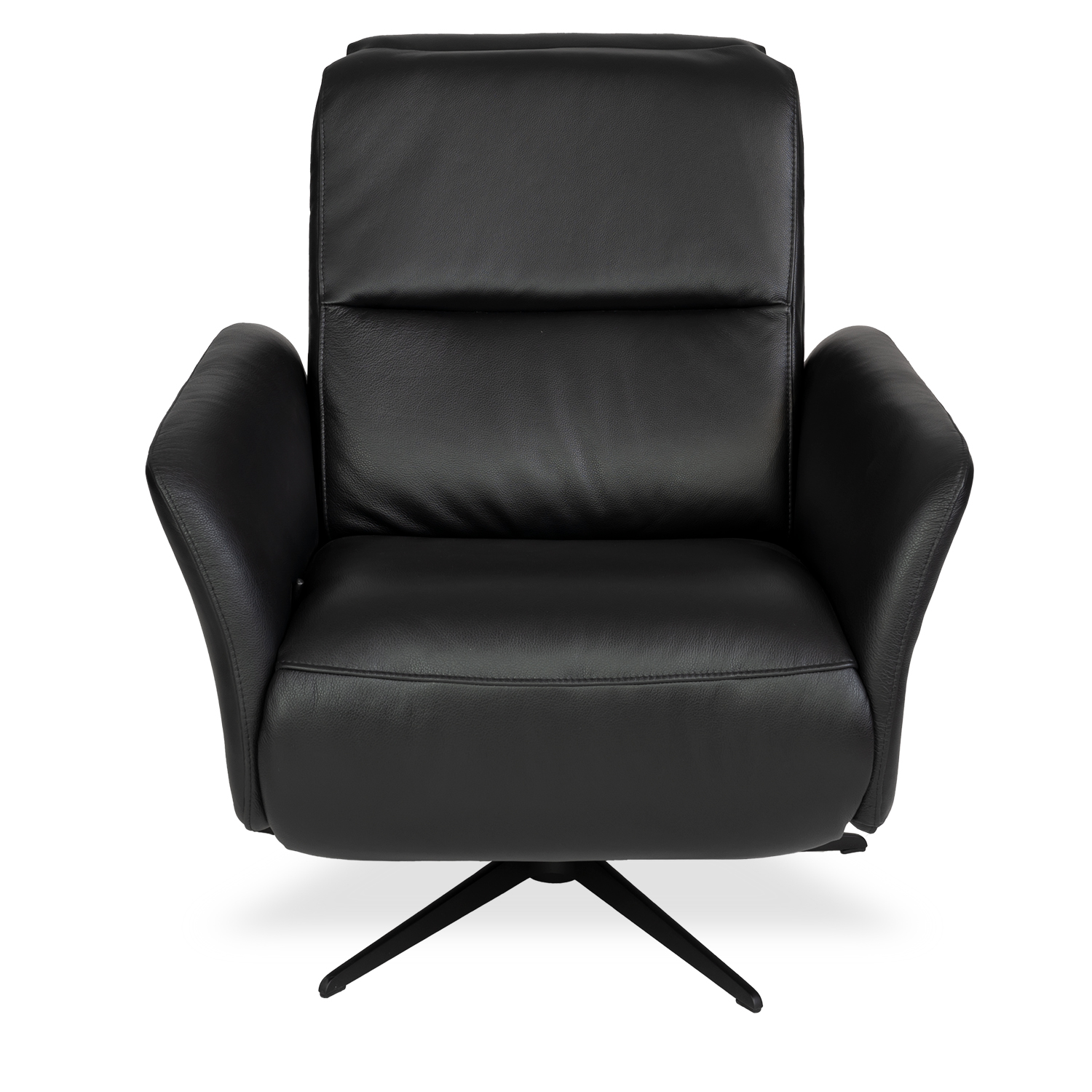 The Brighton Manual Recliner features classic elements of Danish design with a dynamic twist - a manual motion reclining mechanism and the ability to transform from a living room swivel chair to a full-body recliner. With soft black leather and a minimalist black base, this chair has a tailored, clean look. A sleek handle located within the right armrest allows you to adjust the leg and backrests to your level of comfort, while the concealed headrest can be easily lifted for full neck and head support. Made in Europe.