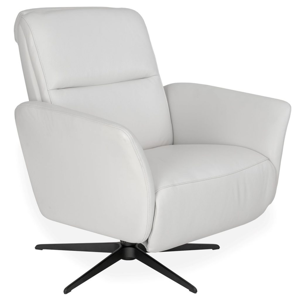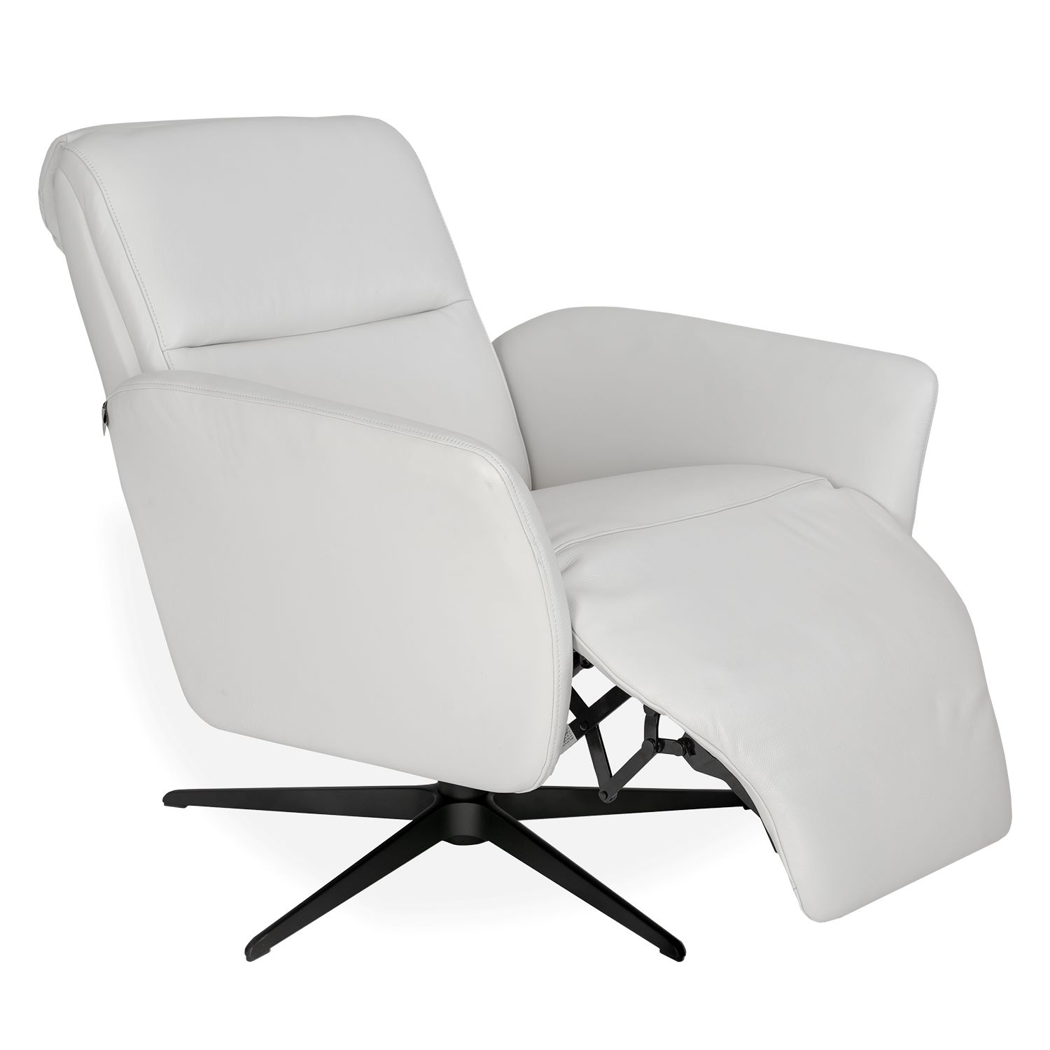The Brighton Manual Recliner features classic elements of Danish design with a dynamic twist - a manual motion reclining mechanism and the ability to transform from a living room swivel chair to a full-body recliner. With soft white leather and a minimalist black base, this chair has a tailored, clean look. A sleek handle located within the right armrest allows you to adjust the leg and backrests to your level of comfort, while the concealed headrest can be easily lifted for full neck and head support. Made in Europe.