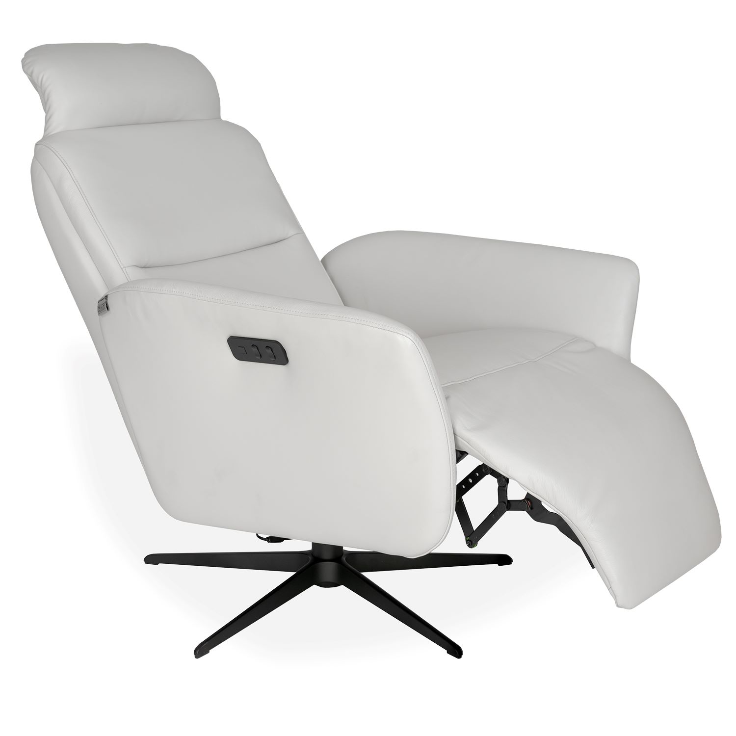 The Brighton Power Recliner features classic elements of Danish design with a dynamic twist - a power motion reclining mechanism and the ability to transform from a living room swivel chair to a full-body recliner. With soft white leather and a minimalist black base, this chair has a tailored, clean look. Sleek buttons located along the right armrest allow you to adjust the leg and backrests to your level of comfort, while the concealed headrest can be easily lifted for full neck and head support. Made in Europe.