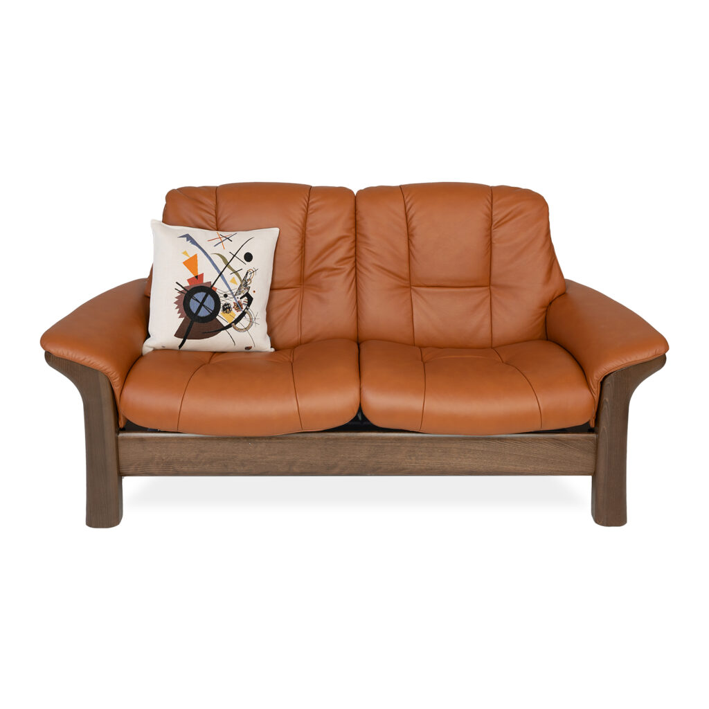 The Buckingham Low Back Loveseat, by Stressless® of Norway, features gentle curves and comfortably padded seats and armrests, with a walnut wood frame and soft New Cognac Paloma leather. Individually reclining seats (manual recline) provide customizable comfort, and Buckingham is equipped with Stressless® Plus™ and Glide Systems, which allow the loveseat to provide continuous support for the head and lower back, while also adjusting the reclining angle of the seats based on shifts of the body. Sleek and comfortable, the Buckingham invites you to sit back and relax in this classic design.