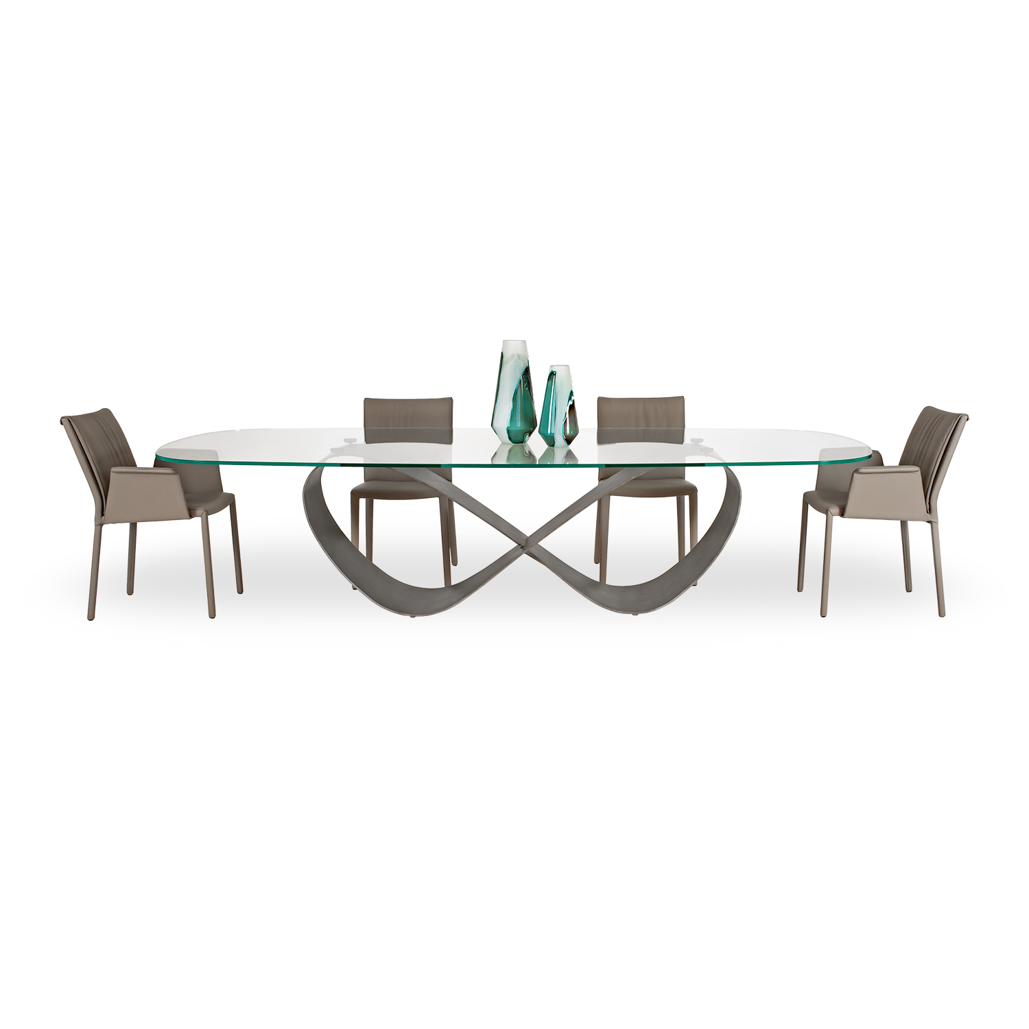 [0] => The Butterfly Dining Table, by Cattelan Italia, is a flowing work of art that takes its inspiration from nature. The ribbon design of the sculptural steel base recalls the graceful wings of a butterfly, while the brushed grey finish gives the table an industrial feel. Extra clear glass allows the base to be appreciated from all angles, and the tabletop's gently rounded corners mirror the curved shape of the base. Butterfly's refined style and eye-catching design will make it the centerpiece of your dining room.