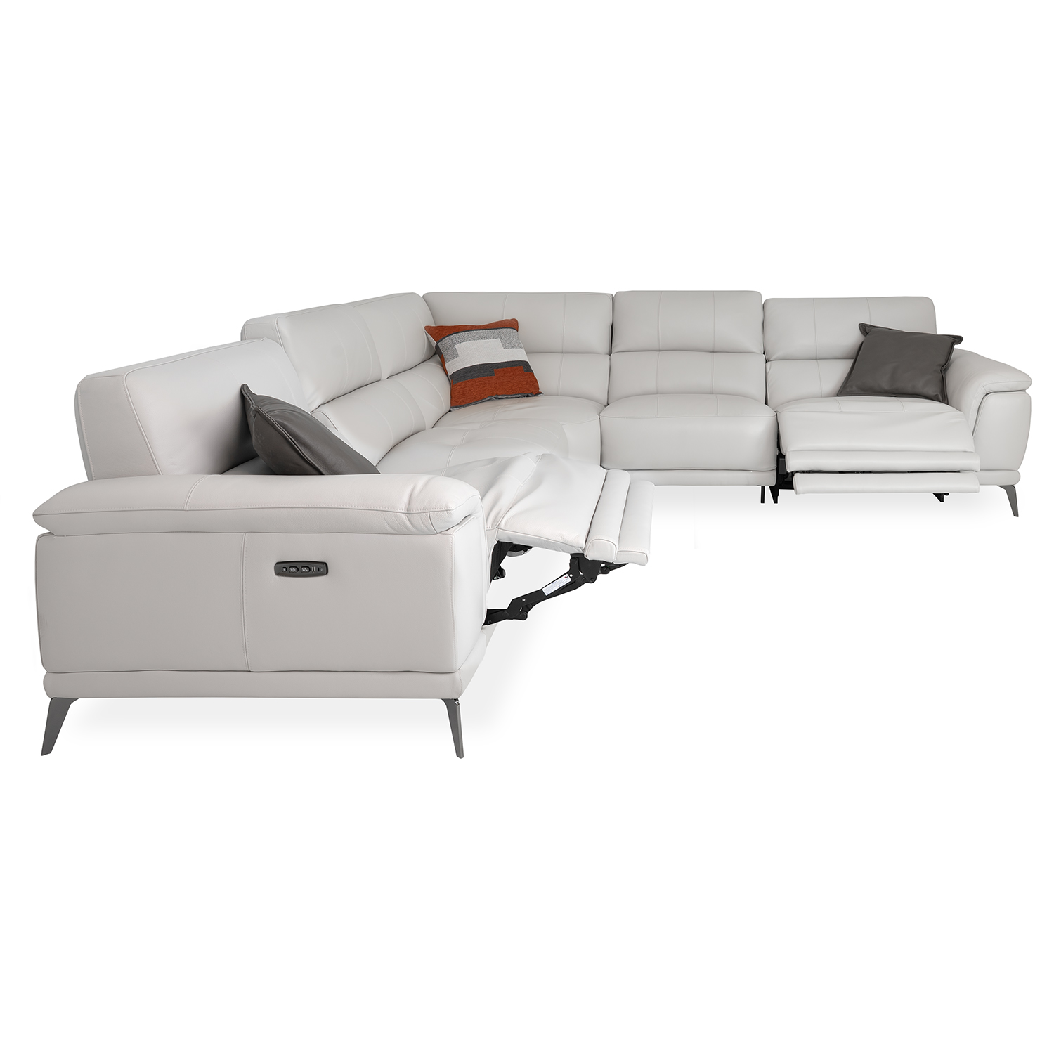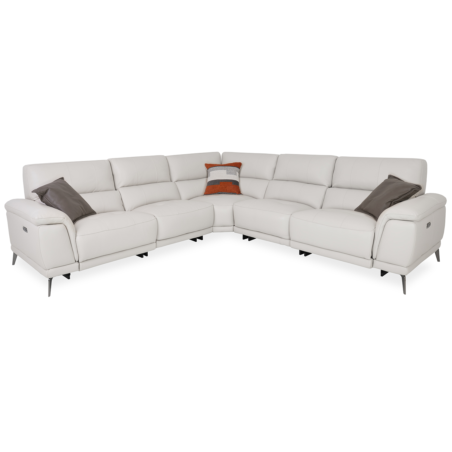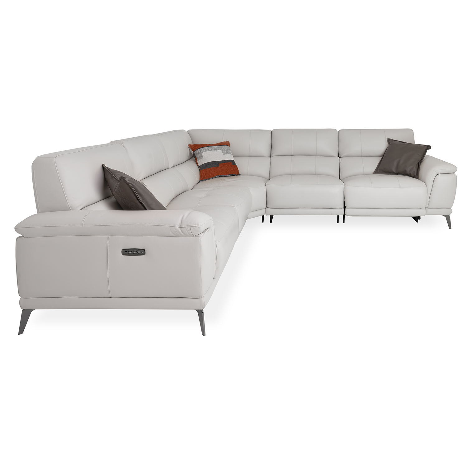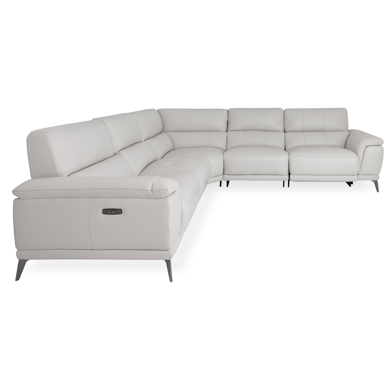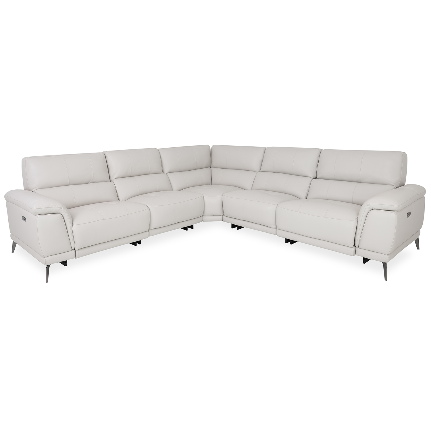 Bring home comfort at a stellar value with the Callum Sectional, part of our Essentials Collection. Upholstered in off-white frost leather, Callum's two end seats feature power motion controls and USB-A/C charging ports to keep you comfortable and connected. Each of the five cushions has tufted stitching for a classic look, and a soft, buoyant feel for effortless relaxation.