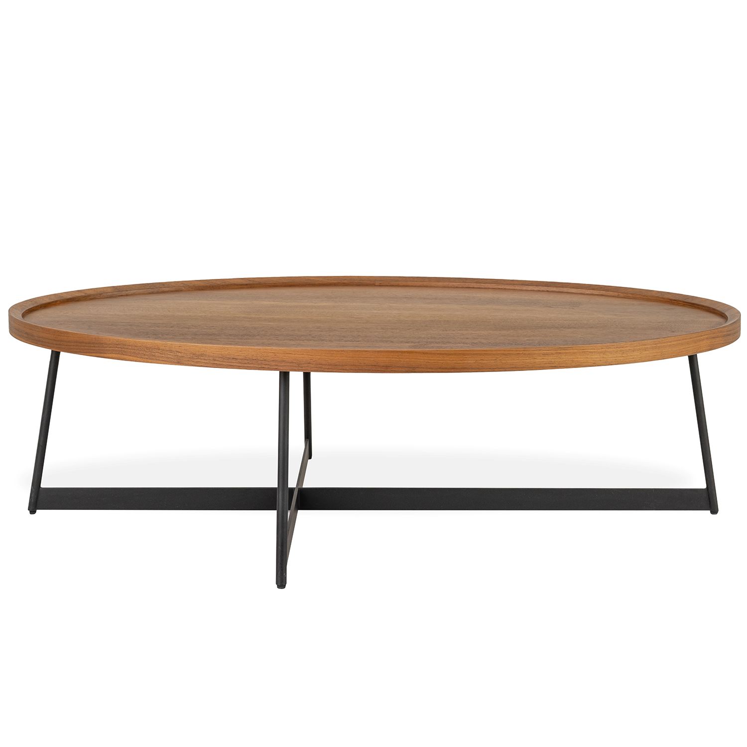 [0] => The Carlyle Coffee Table has a spacious oval-shaped walnut tabletop with a tray-like rim that adds a minimalist, clean feel. The angled dark brown metal base contrasts with the rounded curves of the top, and the thin legs make this table easily maneuverable in most spaces.