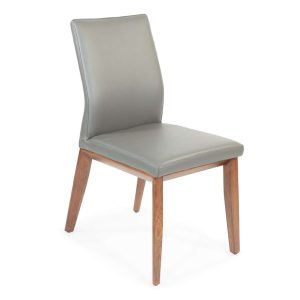 [0] => The Caroline Dining Chair features soft leather upholstery with a smoky grey hue and walnut legs that extend partway up the backrest for a distinctive look. A curved and padded seat ensures your comfort, while the round legs, smooth corners, and tailored stitching create a pleasing and elegant impression. Caroline is a modern classic, perfect for a wide variety of design environments.