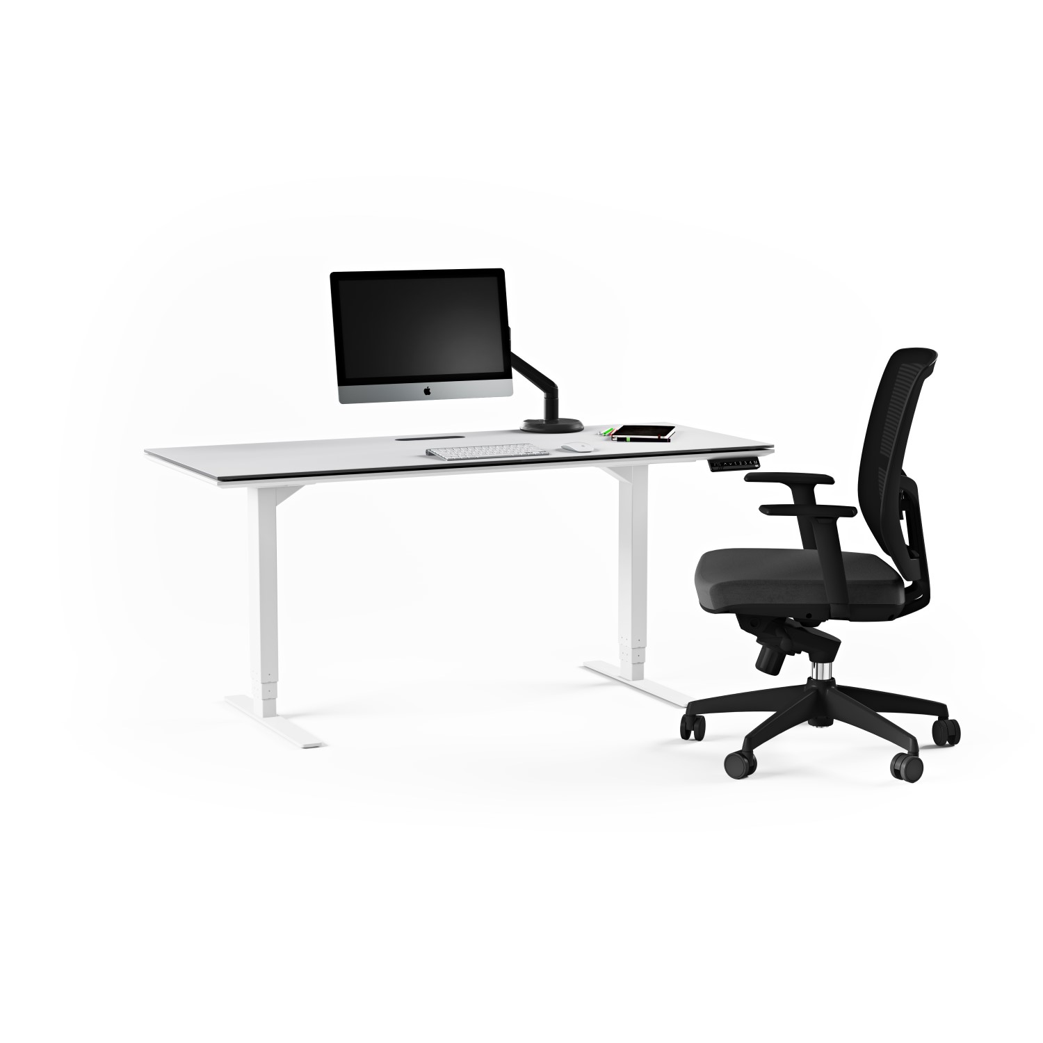 The Centro Large Lift Desk is an electronically powered adjustable sit/stand desk that features a satin white powder-coated steel base and satin-etched tempered grey glass for a design that is both stylish and functional. The digital keypad has programmable height memory settings, and the cable management system keeps cords out of sight. Whether sitting, standing, or somewhere in between, the Centro Lift Desk is always the perfect height to elevate any workday.