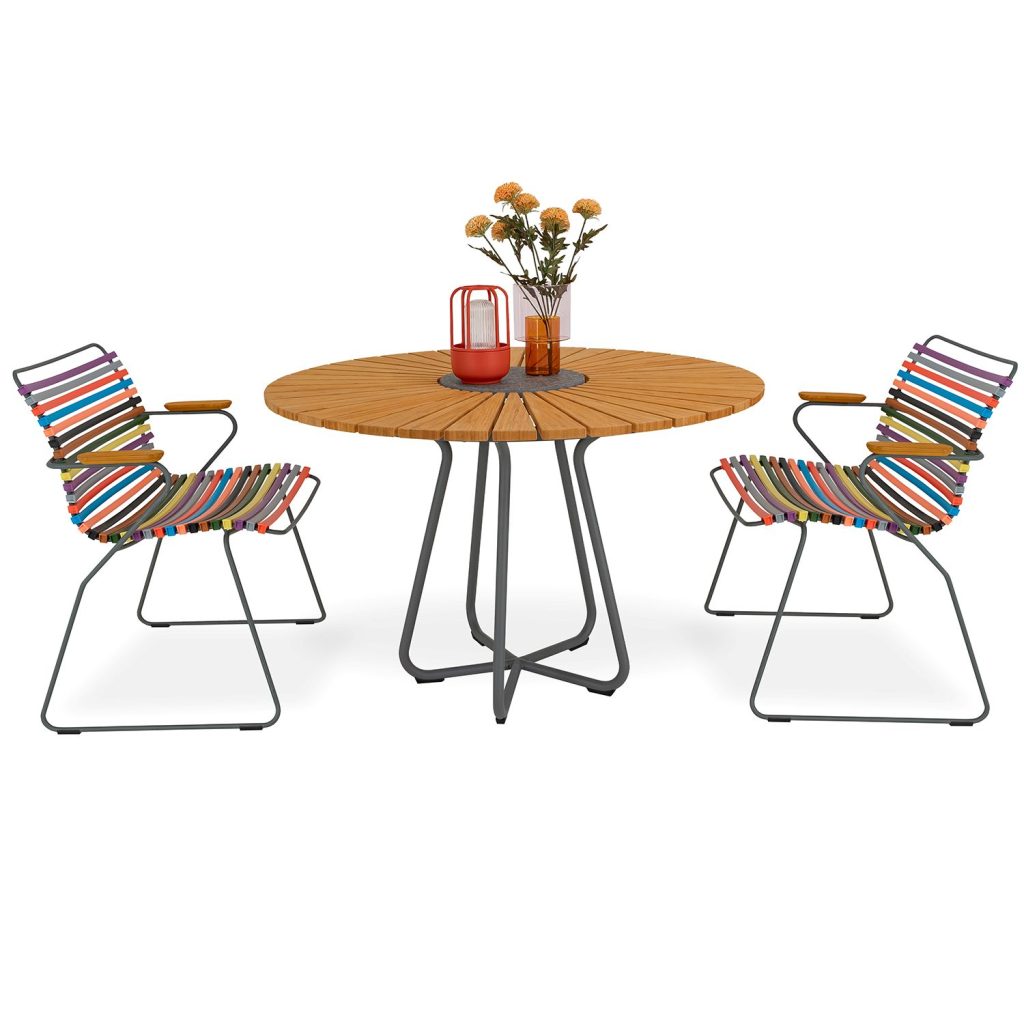 Elevate your patio dining experience with the Circle Dining Table, which features a circular tabletop and sculptural frame designed to maximize leg space. Suitable for use indoors and out, Circle features a grey, powder-coated aluminum frame, warm bamboo wood slats, and a grey granite stone center perfect for setting down hot serveware or condiments. Circle's compact, space-savvy design can seat up to six people, and pairs perfectly with the Click dining chairs for a stylish outdoor dining space.