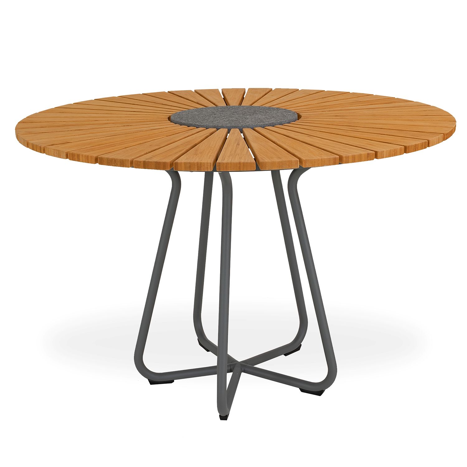 [0] => circle dining table 43" round - powder coated grey aluminum base / bamboo top w/granite center