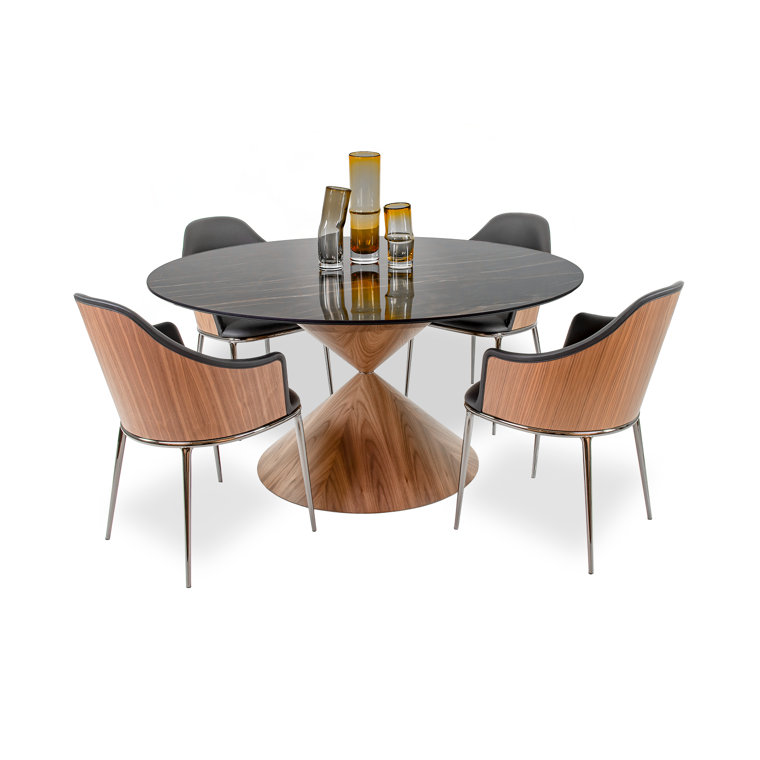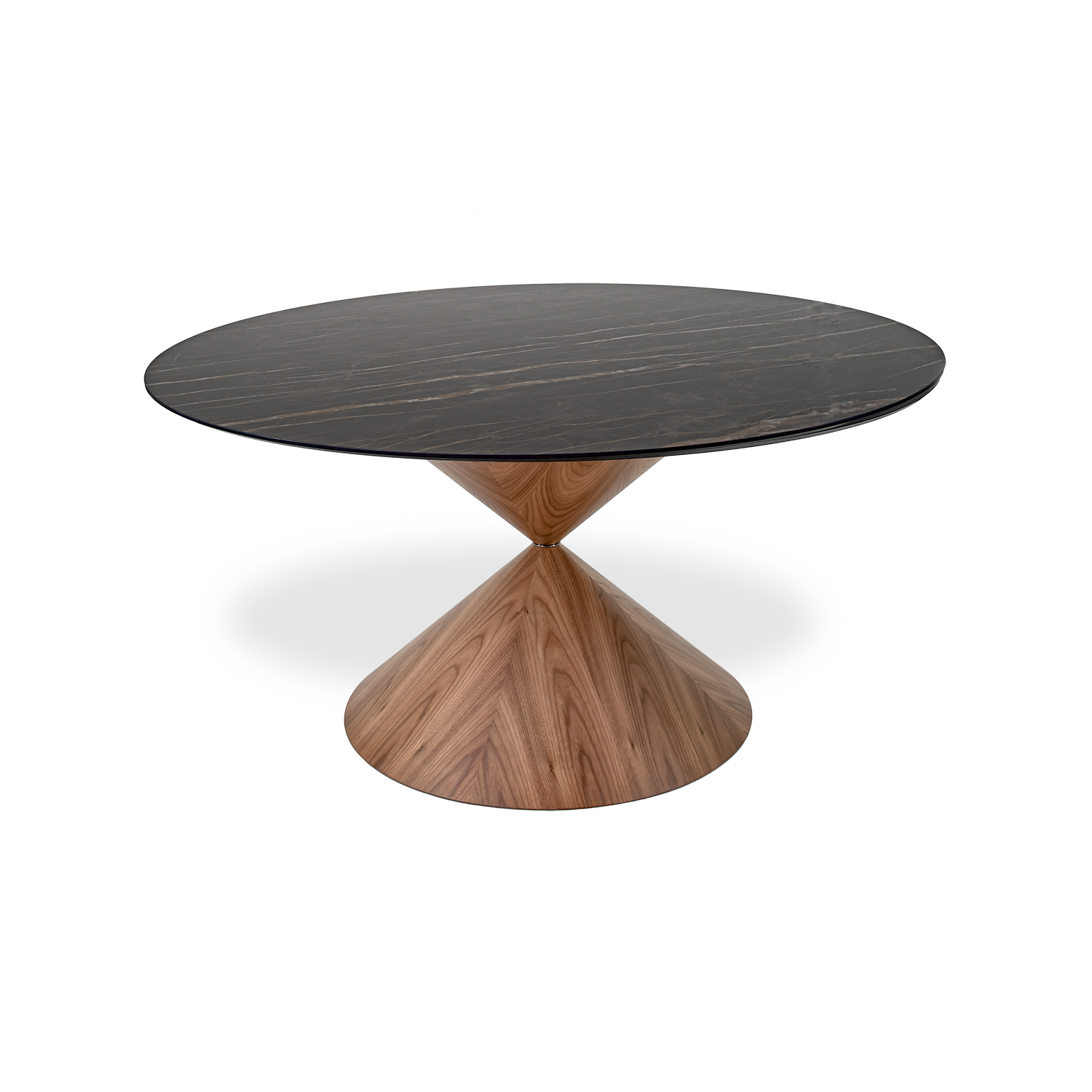 The Clessidra Round Dining Table is a feat of geometry, with its circular top that appears to balance gracefully on an hourglass base. Made of black ceramic marble with earth-toned veins, Clessidra's tabletop rests securely on a flamed walnut base with a black nickel ring at its narrowest point. The natural grain of the wood echoes the veining in the tabletop, while the overall silhouette creates an impression of drama, elegance, and subtle strength. Clessidra is nothing less than functional art for your modern dining room.