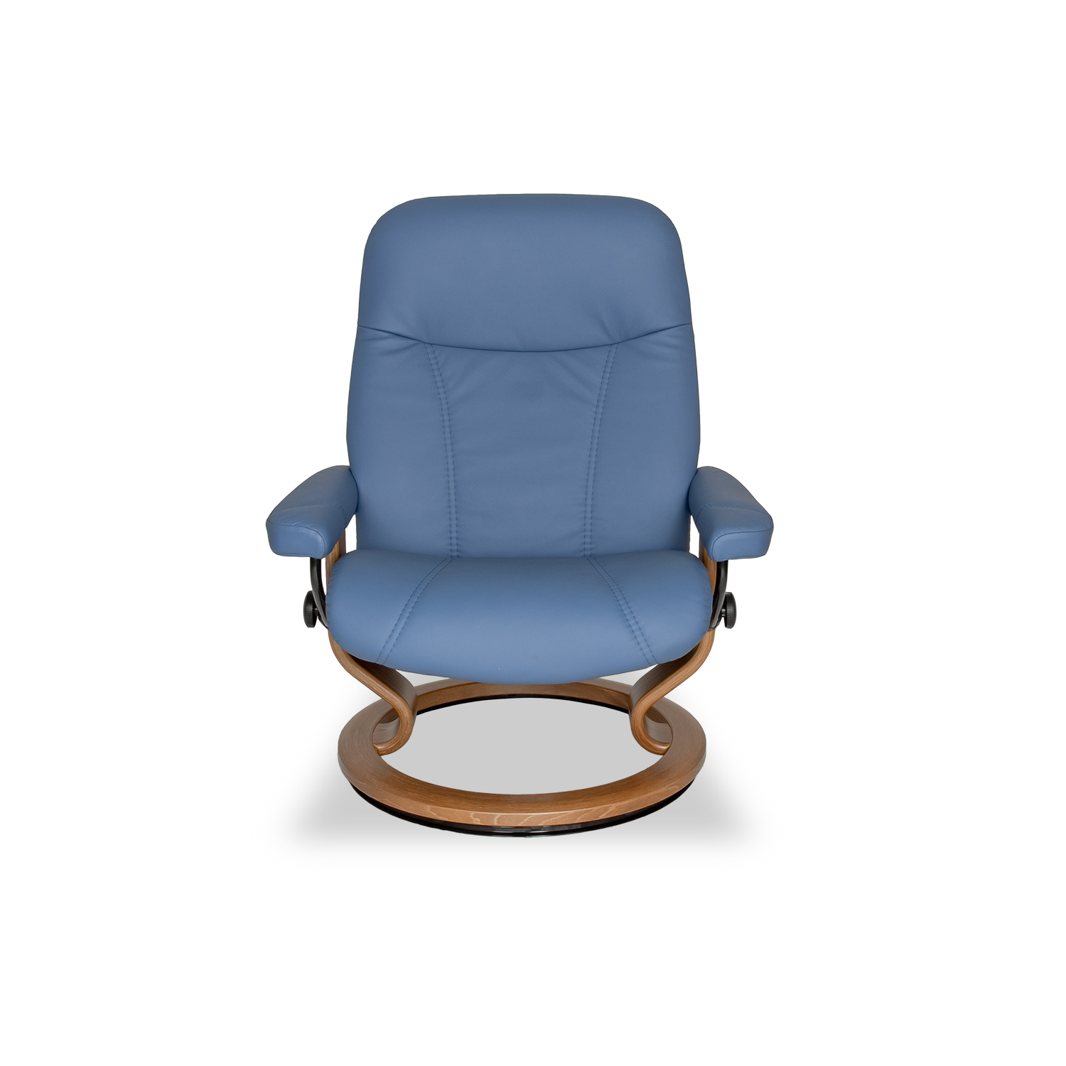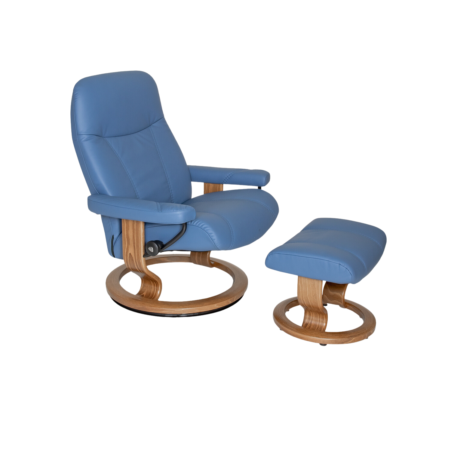 The Consul Large Chair and Ottoman, available in lazuli Batick leather with a teak classic base, is a classic, high quality Stressless® design that truly has it all — aesthetics, design value, and comfort-ensuring mechanisms. The Consul is equipped with Plus™ and Glide systems, which allow the chair to provide continuous support for the head and lower back, while also adjusting the reclining angle based on shifts of the body. Consul is a classic Stressless® recliner that fits easily into any home.