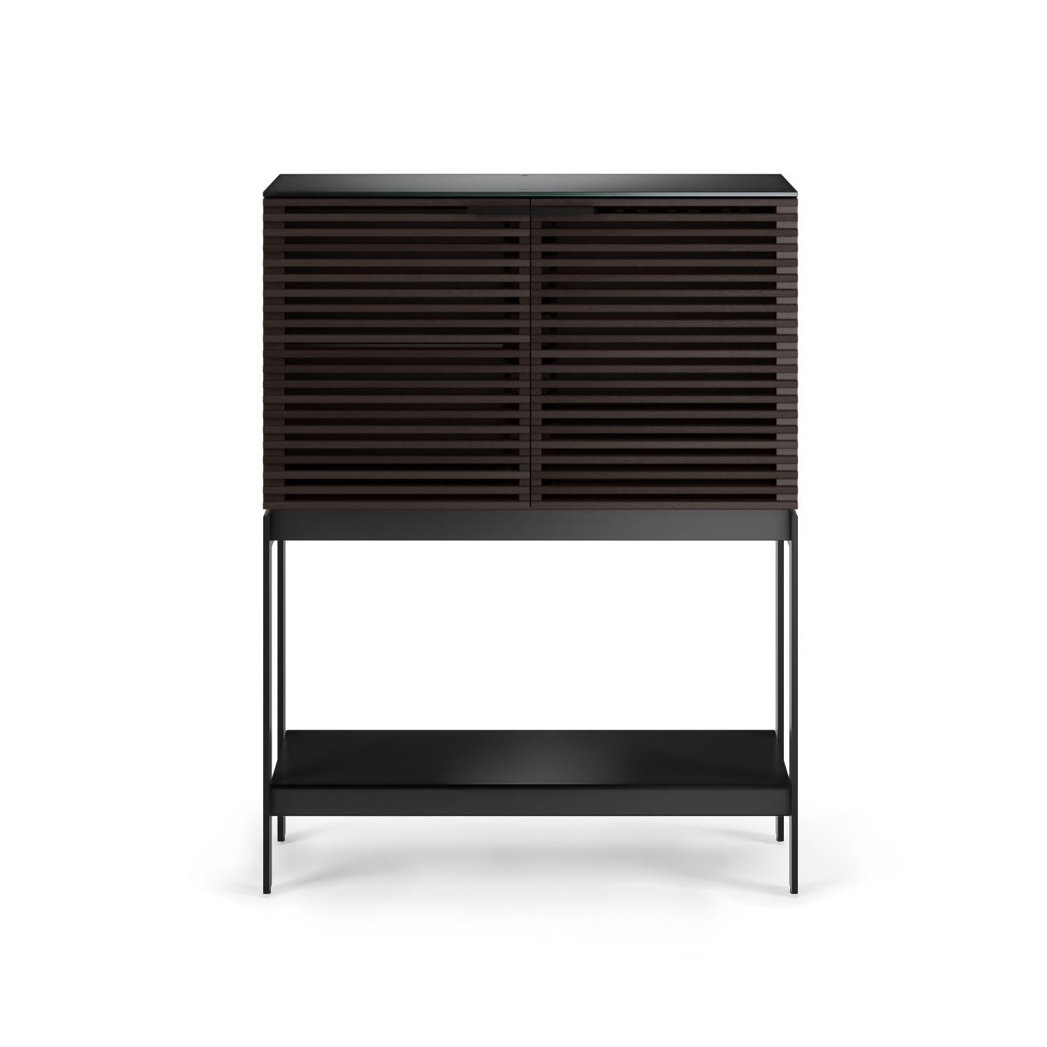 Shown in charcoal-stained ash with a black powder-coated steel frame, the Corridor SV Bar Cabinet has an elegant exterior and an interior full of useful features. Open the hardwood louvered doors to reveal a stemware rack, horizontal wine rack, two adjustable glass shelves, and a handy push-to-open drawer that can be installed on either side of the cabinet. A satin-etched tempered glass tabletop offers a durable surface for preparing your favorite cocktails, while a lower shelf provides a storage and display area. Be the host with the most, or just unwind after your day, with the Corridor SV Bar Cabinet.