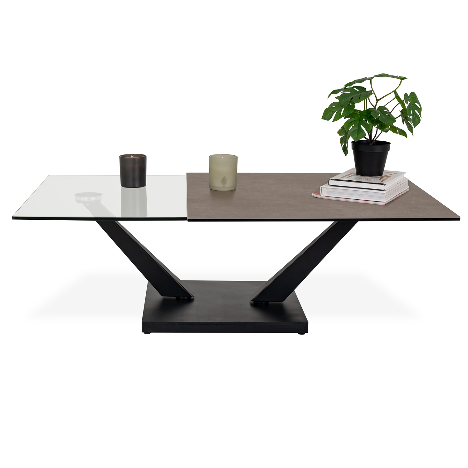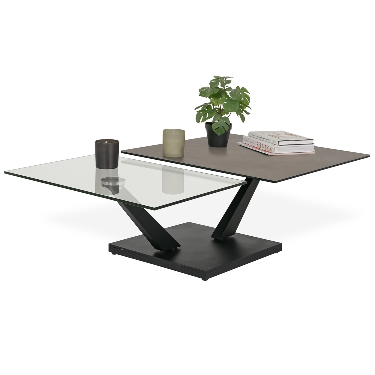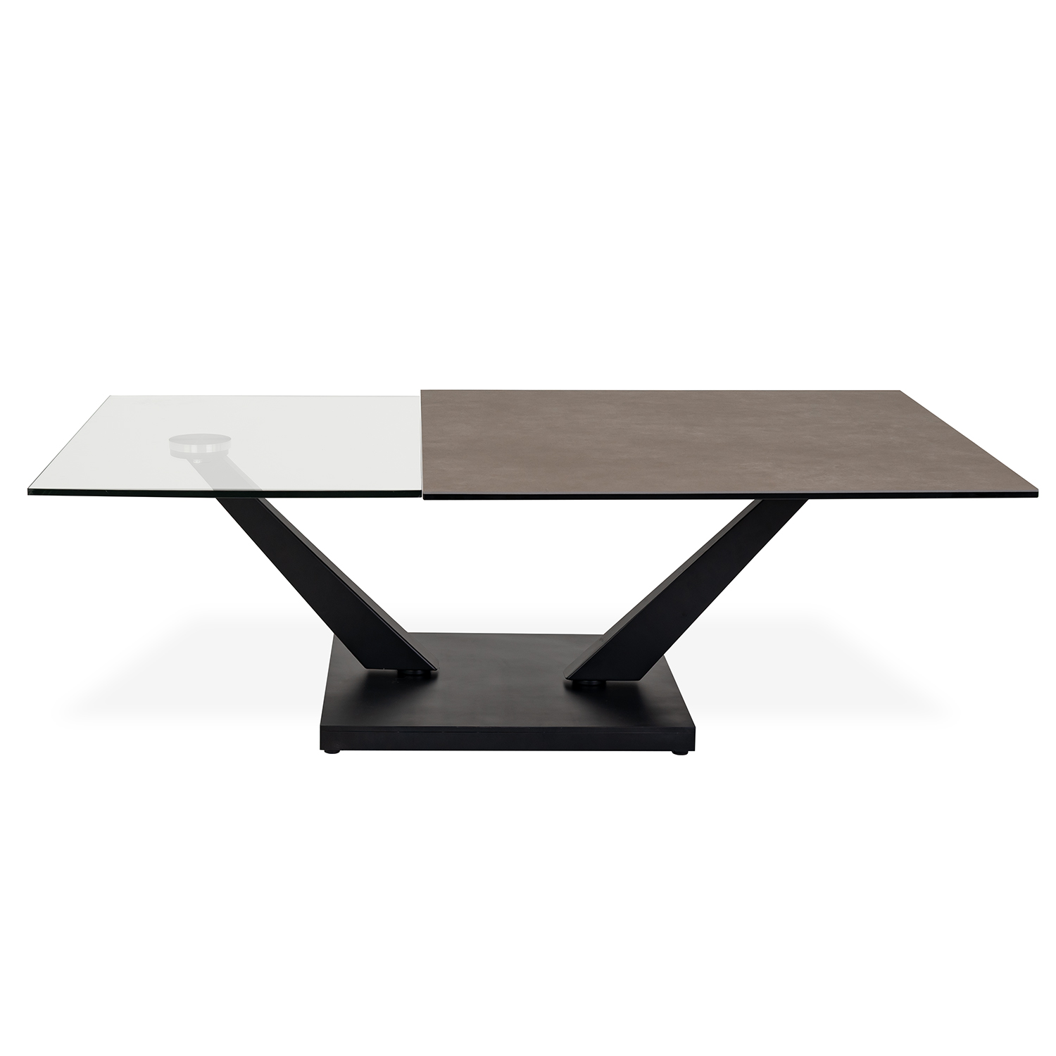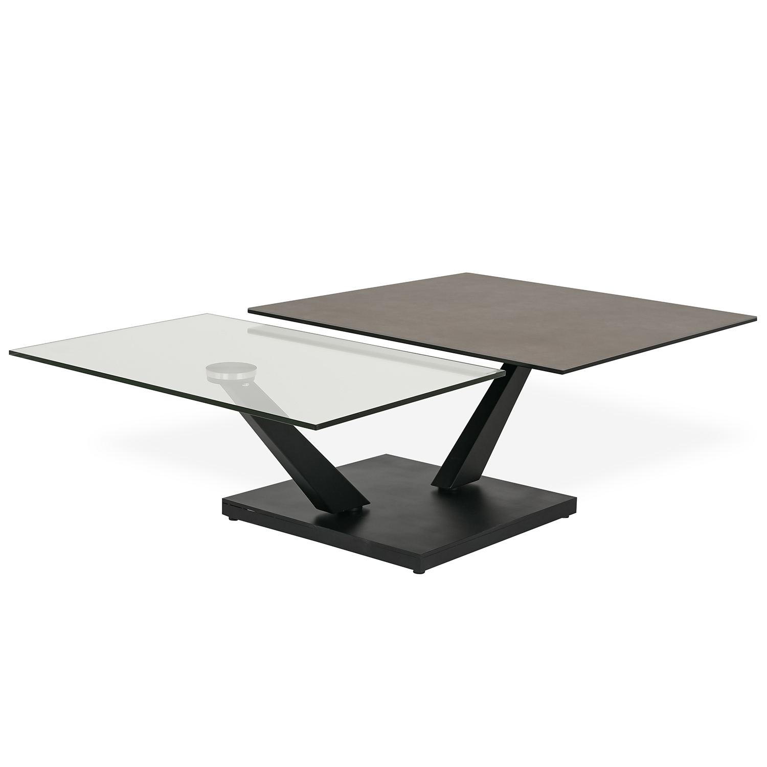 [0] => Fusing bold aesthetics with sleek functionality, the Dorio Coffee Table boasts two nested tabletops that expand outward using a smooth, synchronized mechanism. Rotate between one or two tops depending on your needs or rearrange the positioning of the tops to create intriguing geometric interplays. The matte grey ceramic of the square upper tabletop is complemented by the clear glass of the lower rectangular tabletop, with angled legs and a square base in black metal. Pair with the matching Orio End Table to complete your look.