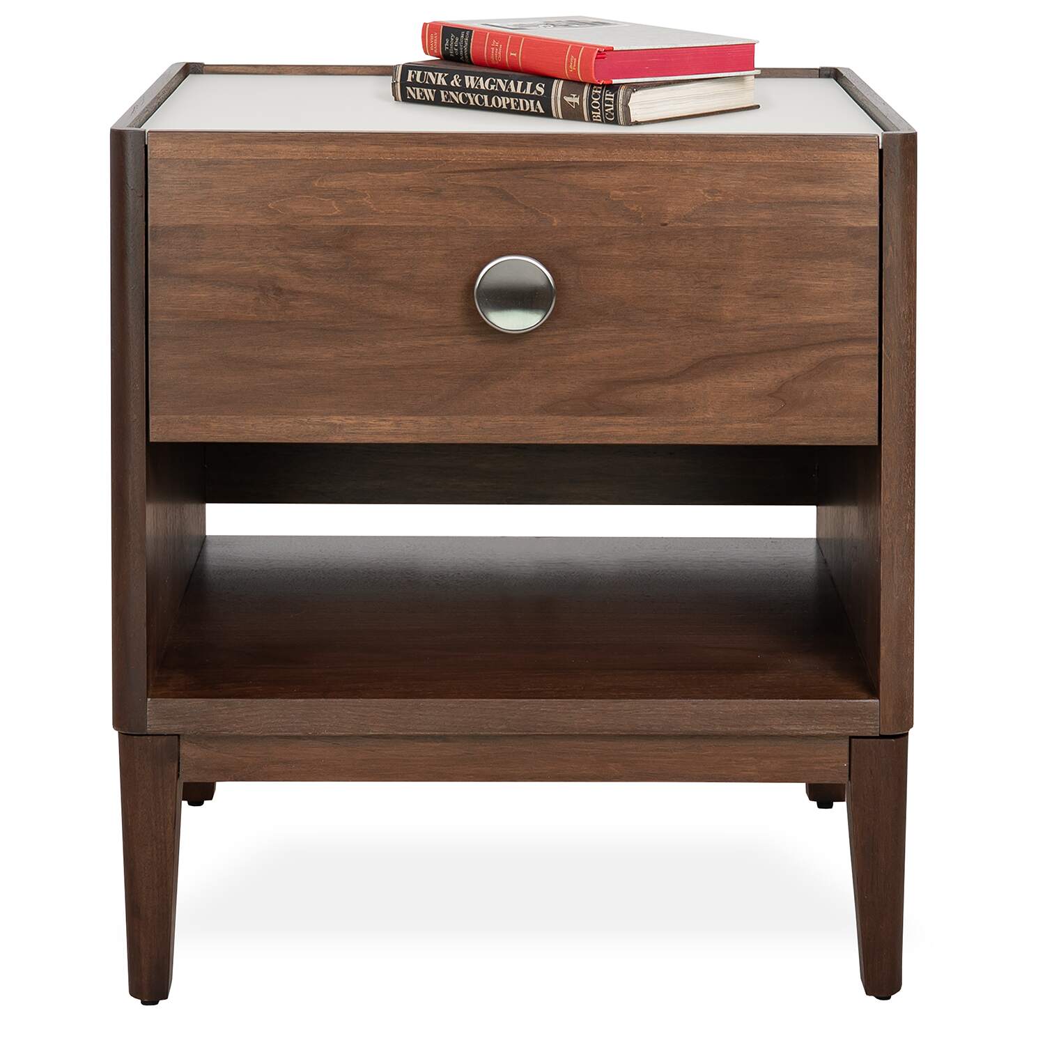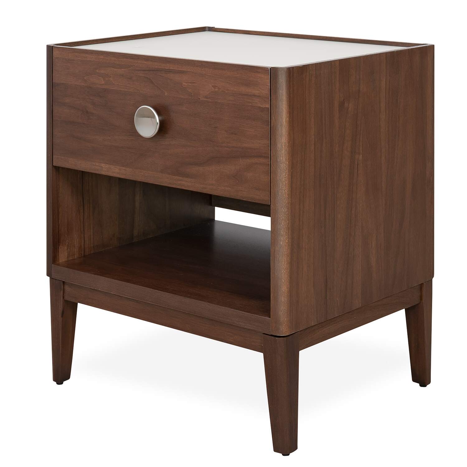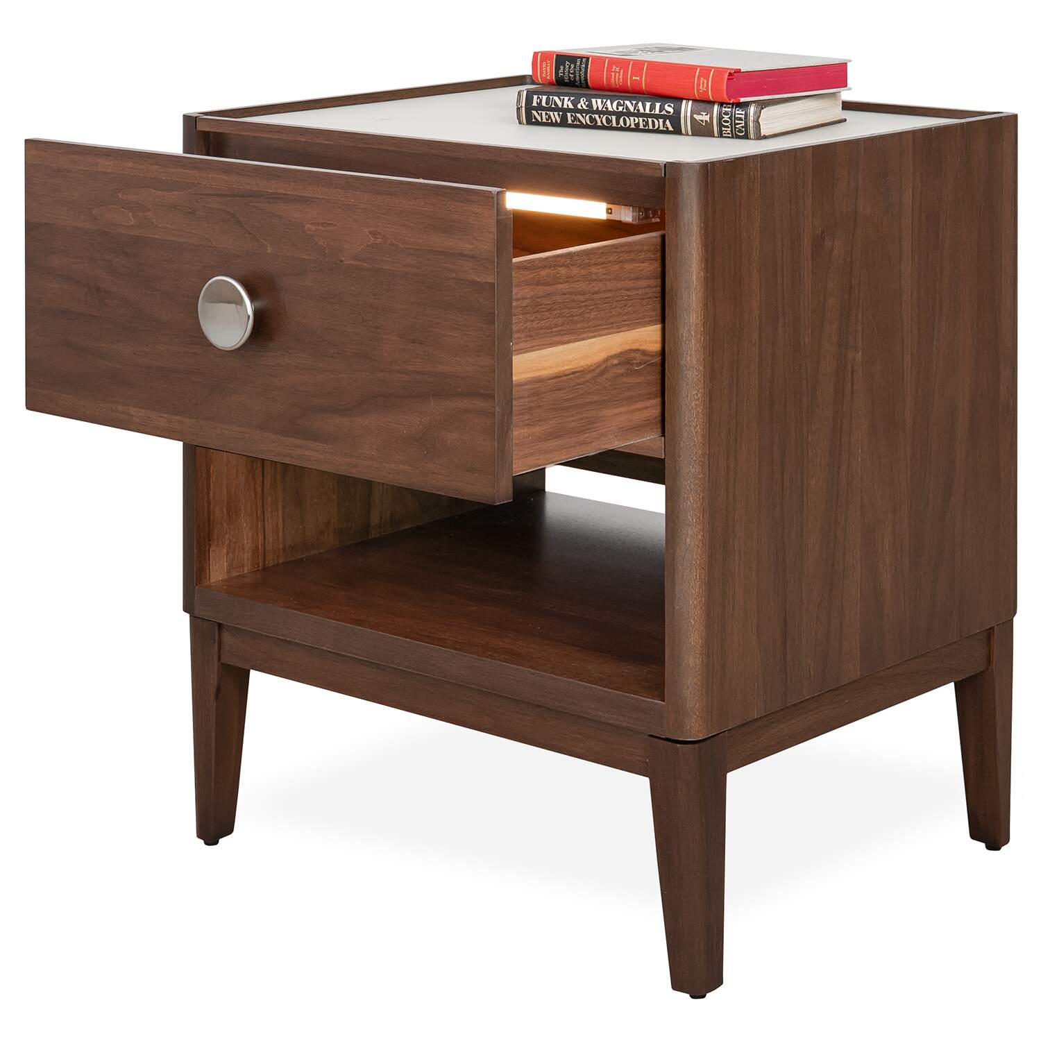 The Ema Small Right Nightstand unites classic warmth with clean, modern finishes and integrated technology. Ema's walnut frame is topped with contrasting glass in sandy off-white and accentuated with a round drawer pull in brushed nickel. The soft-close drawer has an LED light within that turns on when you open it, while the open compartment below provides additional storage. An integrated wireless charger in the left side of the tabletop makes this nightstand ideal for placing on the right side of a bed to keep charging devices in easy reach. Pair Ema with the coordinating Parma Bed for casual bedroom elegance.