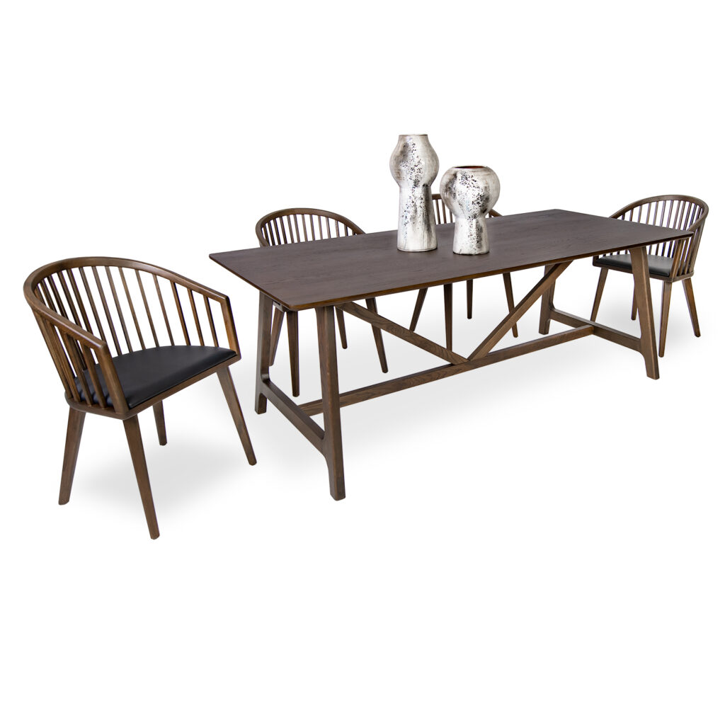 [0] => Bring a classic look and enduring style to your dining room with the Enigma Rectangular Dining Table. Made with a brown oak finish, Enigma features a smooth tabletop with gently rounded corners and a masterfully crafted trestle base with striking diagonal supports resting on a low beam. Perfectly paired with other items in the Enigma collection, this table can seat up to eight diners for lively gatherings and memorable meals.
