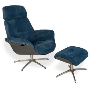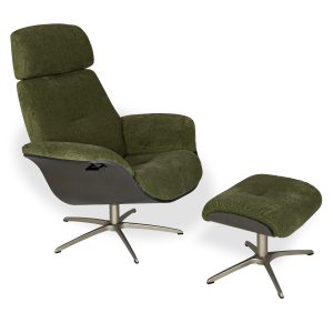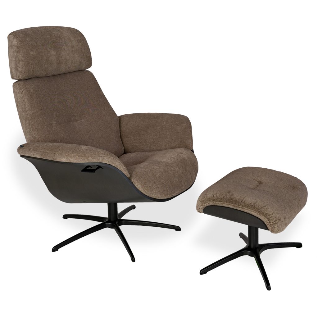 [0] => Designed in Norway, the Falcon Chair and Ottoman feature a form reminiscent of the classic Eames chair and ottoman, with rounded lines and curved wood framing for optimal style and comfort. Falcon is upholstered in sand brown Safir fabric and supported by a wooden shell with a charcoal finish. The black metal star base is equipped with a mechanism that lets the chair swivel 360 degrees, and a lever under the right armrest allows you to recline the chair to your perfect angle. Falcon's headrest is also manually adjustable, letting you customize it to your preferred height. Both timeless and modern, the Falcon Chair and Ottoman will bring you top-tier relaxation while making an iconic statement.
