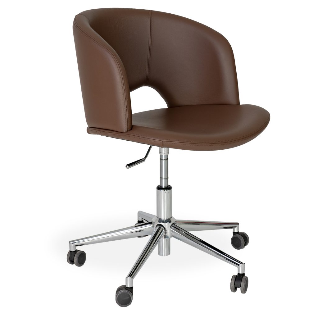 The Fashion Chair, made in Italy, features brown leather upholstery and a chrome base on castors. Simple yet elegant, this chair has matching stitching and an open lower back, resulting in a clean, tailored look that brings comfort and style.