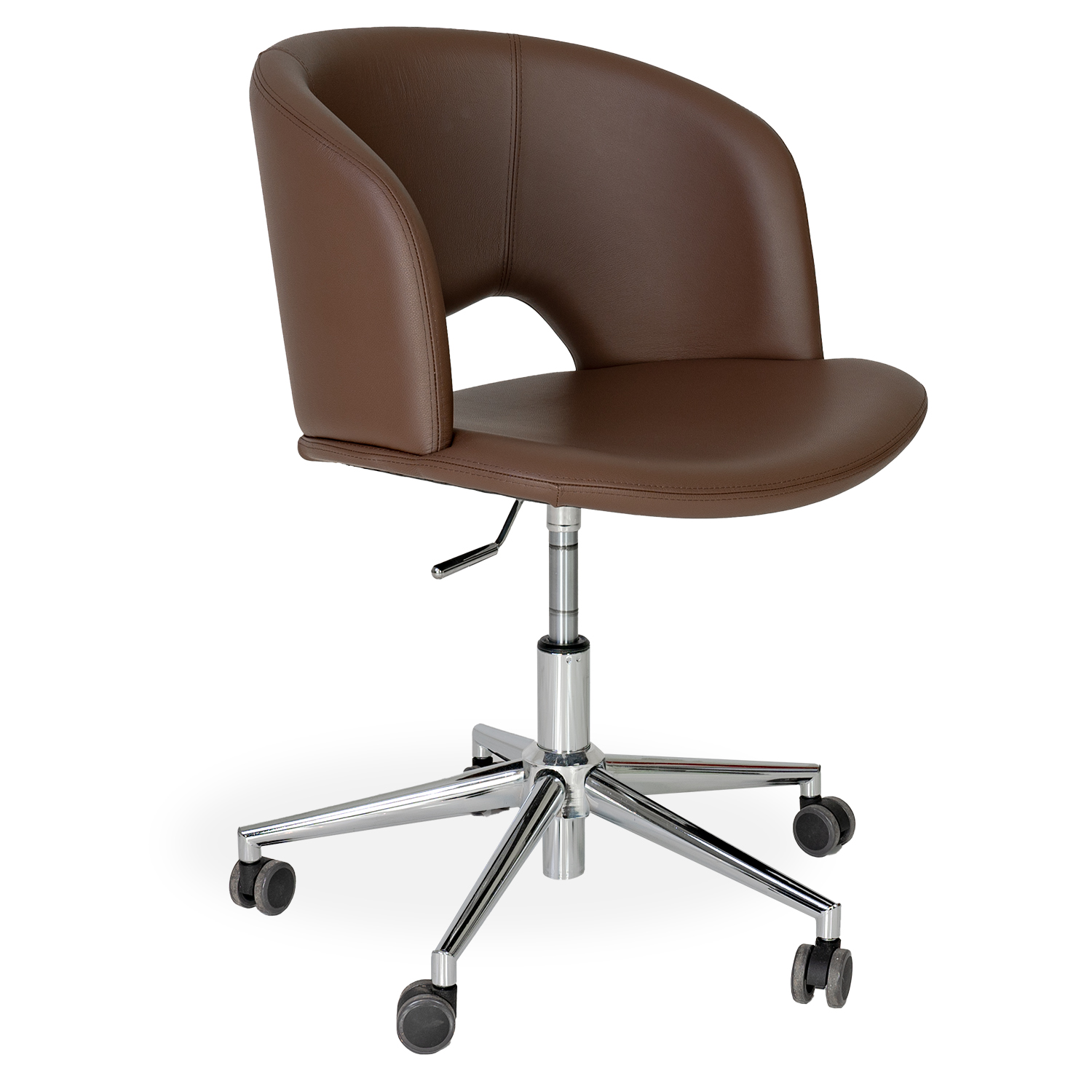 [0] => The Fashion Chair, made in Italy, features brown leather upholstery and a chrome base on castors. Simple yet elegant, this chair has matching stitching and an open lower back, resulting in a clean, tailored look that brings comfort and style.
