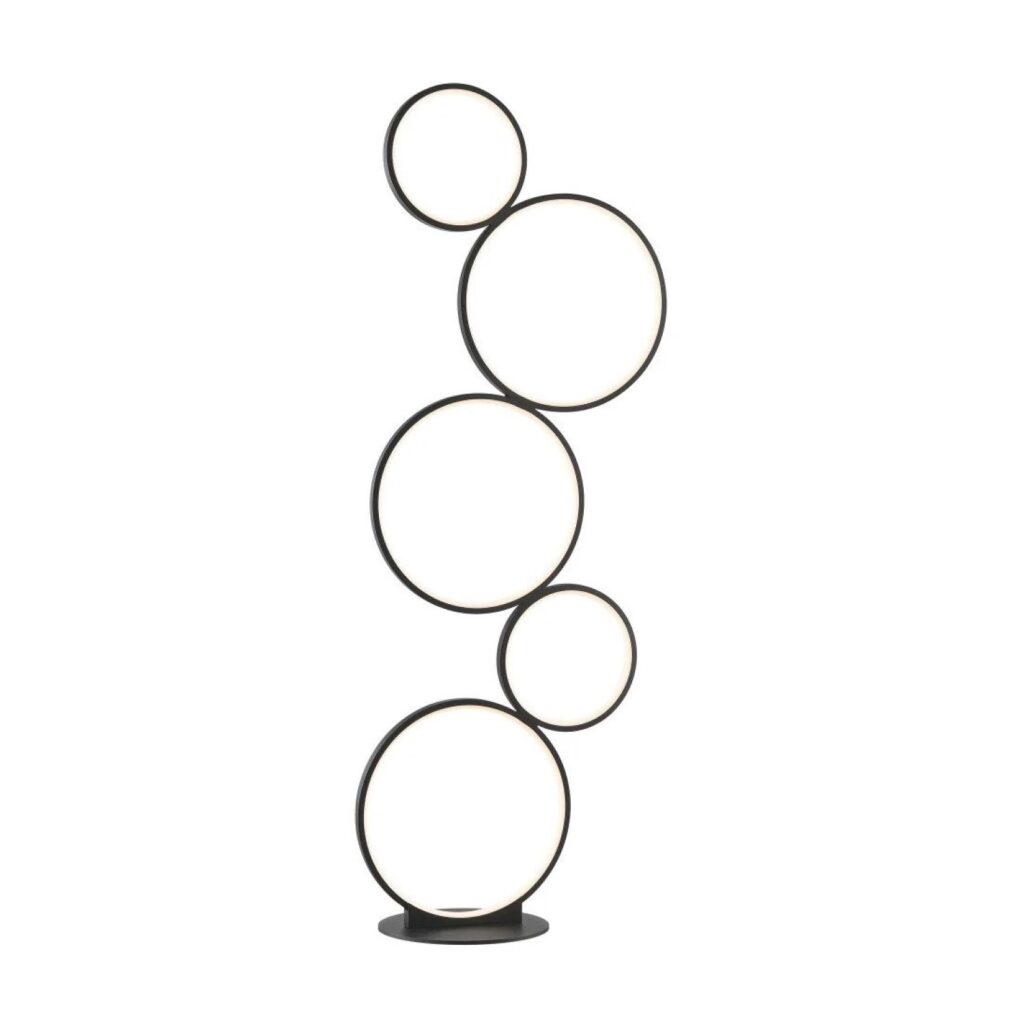 [0] => Add a jaunty and playful source of light to your interior with the Felicia Floor Lamp, shown here in a matte black finish. This lamp is composed of five stacked circles that emanate a warm glow from inset 24W LED strips, and includes a foot switch. Whether you place it in your bedroom, living room, or office, the Felicia will lighten your mood whenever you look at it.