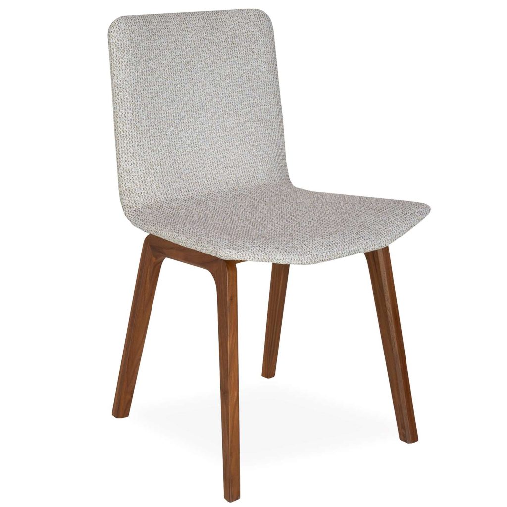 The Flex Dining Chair is contemporary and attractive, with an oiled walnut frame that complements oiled walnut dining tables. The Lind fabric upholstery has variegated tones of grey and a rounded, yet square frame that complements the bent U-shape of the legs. A classic look with a modern design.