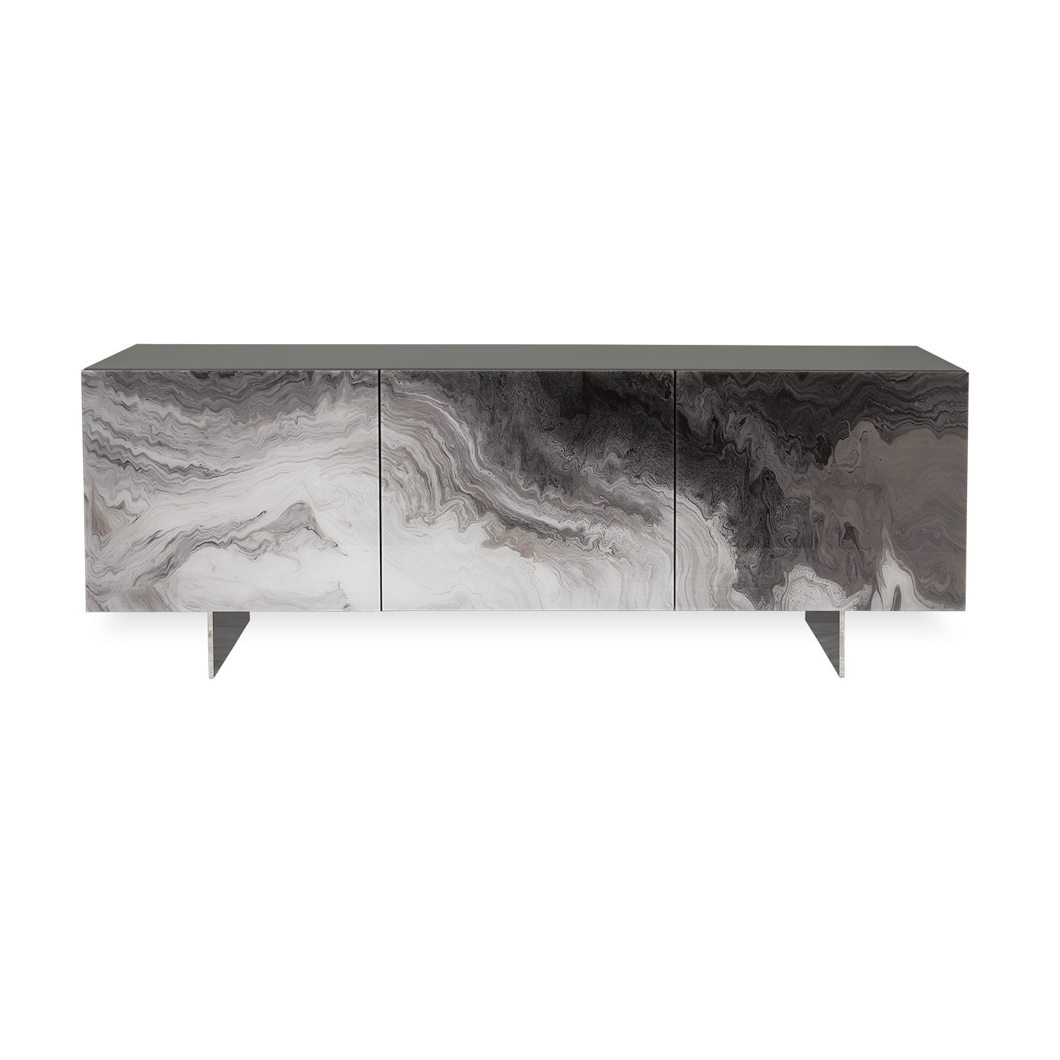 [0] => The Focus Crystalart Sideboard, made in Italy by Cattelan Italia, is both a functional storage solution and a captivating work of art. Focus features a matte graphite frame with three stunning Crystalart doors accented with aluminum profiles, as well as inner glass shelves that provide ample storage space. Crystalart is crafted from extra-clear glass with an artistic print applied to the underside and has a contemporary, marble-like look that makes an impression in any space. One graphite drawer rests behind the center door and sleek steel feet hold up the structure.