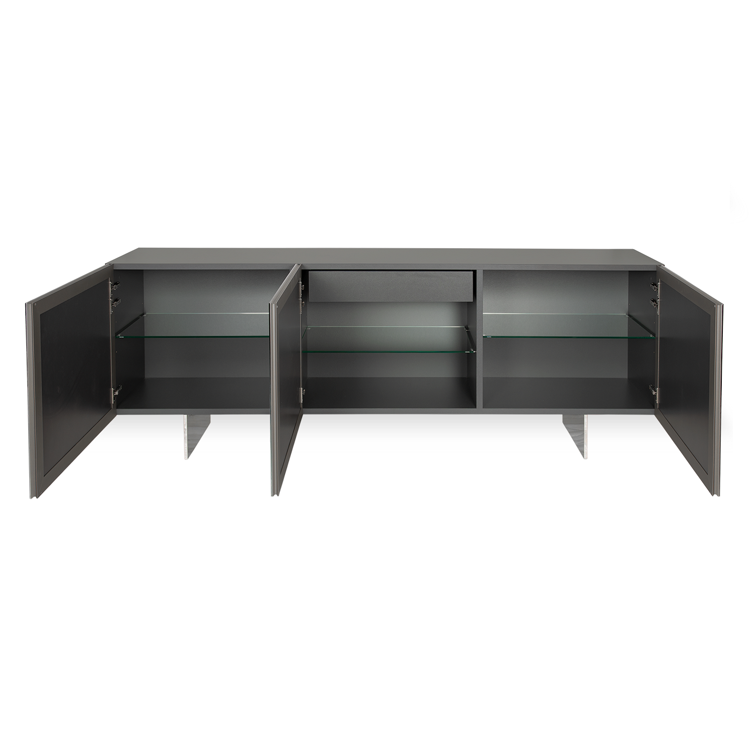[0] => focus sideboard with three doors in crystal art cy01 with aluminum gfm11 profiles, polished stainless steel feet and structure in matt graphite op69. includes one drawer mounted behind center door.