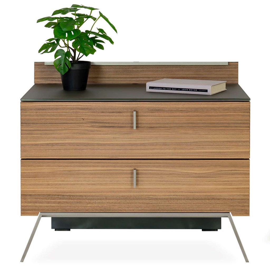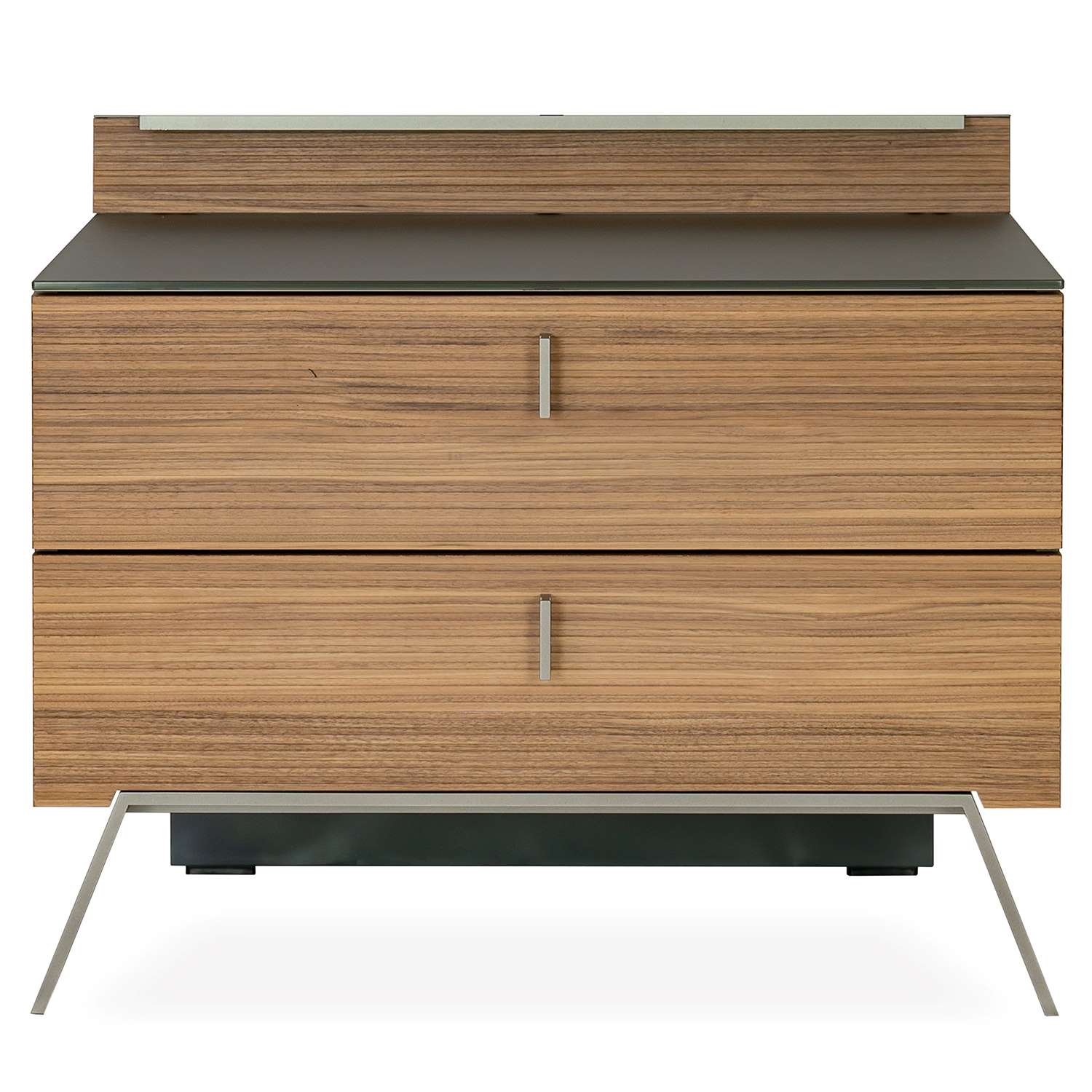 [0] => gala 2 night table w/ 2 drawers, glass top, panel with led lighting & switch - walnut w/graphite lacquer and titanium legs