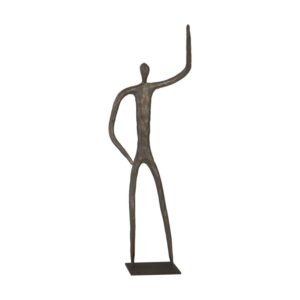 [0] => The Gesturing Figure Sculpture features the slim figure of a person, posing with one arm up and one arm down. Made from metal rendered in a bronze powder finish, this sculpture can fit into both contemporary and modern design environments and is the perfect accent piece for a tabletop or shelf. The Gesturing Figure looks great standing alone or in combination with the other sculptures in the Figure collection.