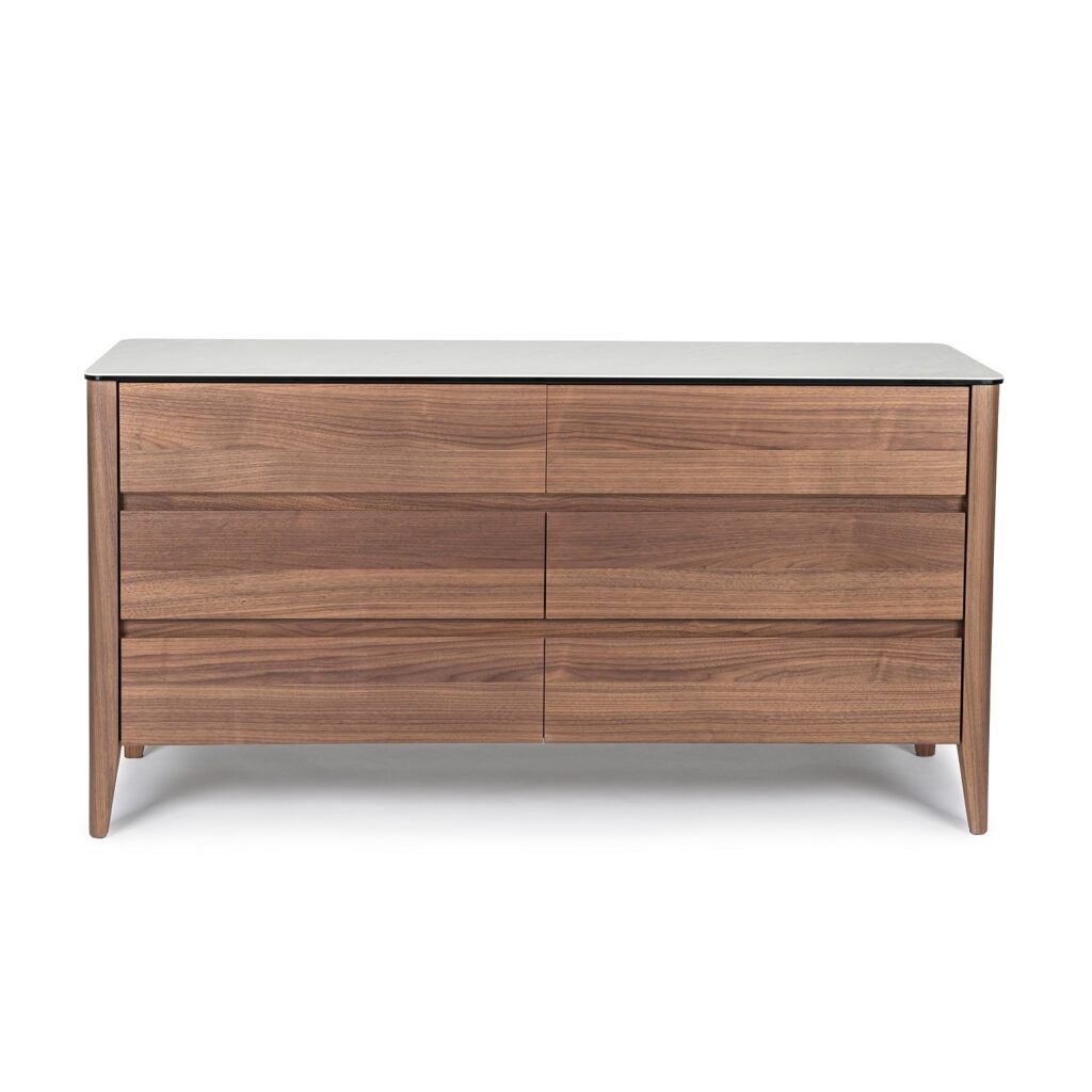 [0] => The Harwell Dresser, available in walnut with a white ceramic top, effortlessly combines a classic look with modern design. Six drawers provide ample storage space and feature carved handles. The horizontal lines of the drawers contrast the vertical ones of the legs, adding a textured look that is further heightened by the smooth ceramic top. Simple and sleek, this piece can integrate into any design environment.