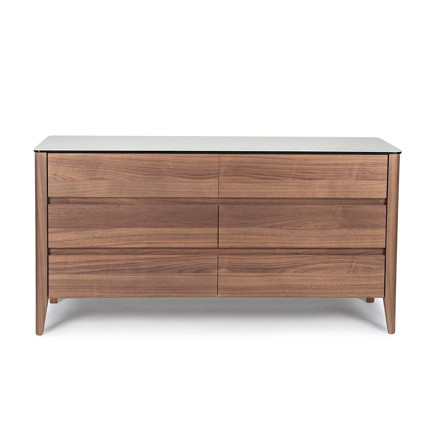 The Harwell Dresser, available in walnut with a white ceramic top, effortlessly combines a classic look with modern design. Six drawers provide ample storage space and feature carved handles. The horizontal lines of the drawers contrast the vertical ones of the legs, adding a textured look that is further heightened by the smooth ceramic top. Simple and sleek, this piece can integrate into any design environment.