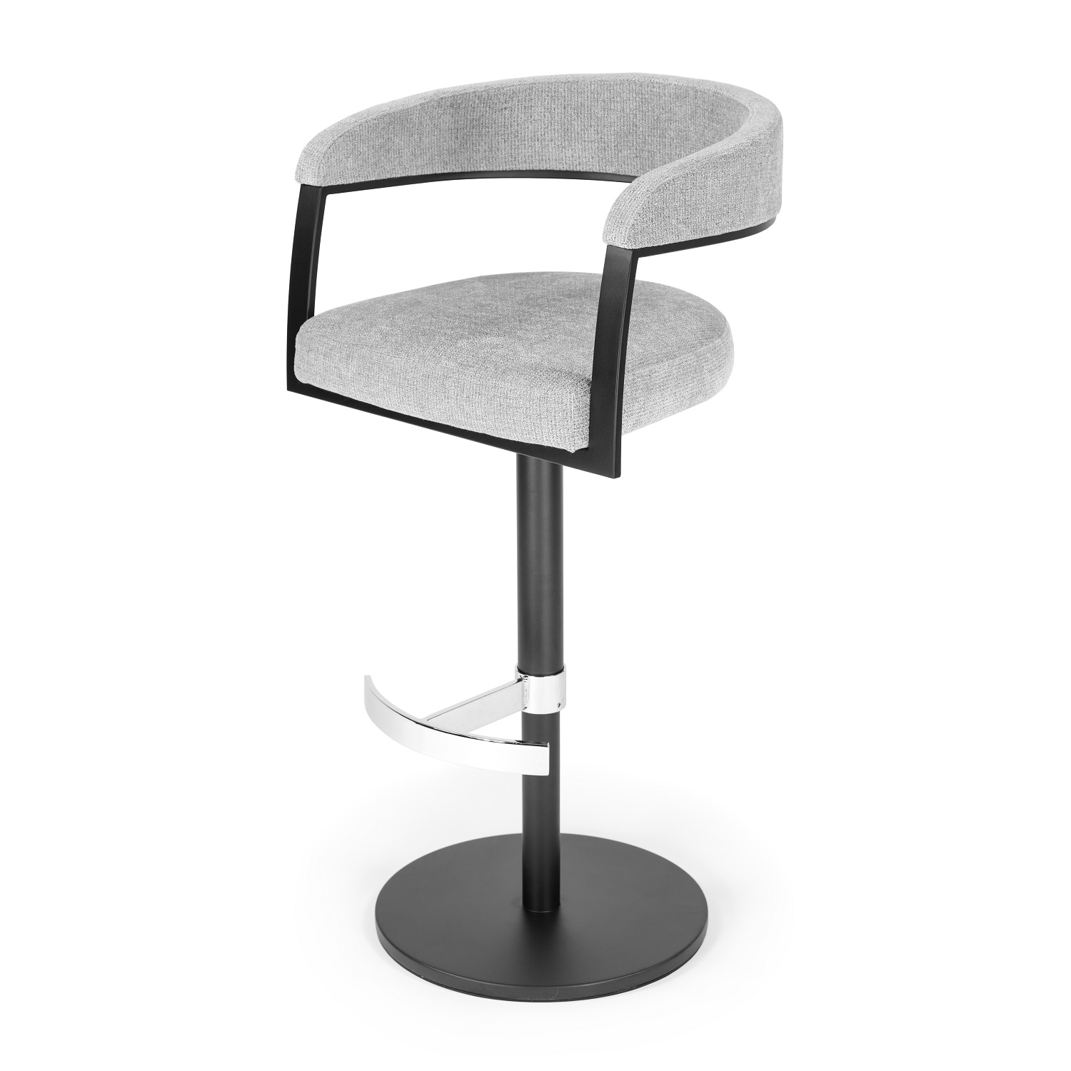 [0] => The Helix barstool, available in sleet grey Samson fabric, has smooth curves and a floating backrest with generous padding and upholstery. Helix's heavy-gauge black steel frame ensures long-lasting stability while also maintaining a spring-like feel for extra comfort. The stool is height adjustable from counter to bar table height via a hydraulic lift column.
