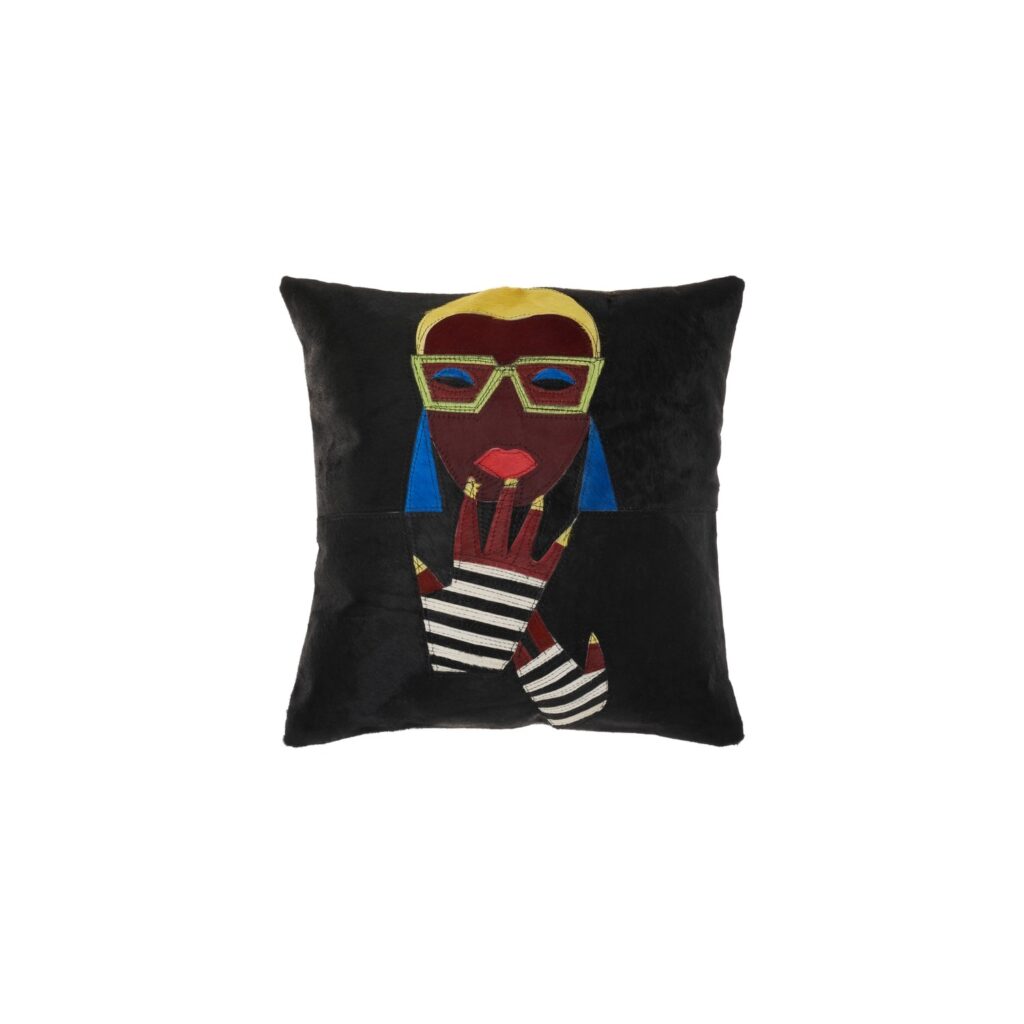 [0] => Made with genuine hair-on-hide leather, the Isabella Pillow is multicolored, mod, and bursting with retro glamour. Leather pieces are stitched to form the portrait of a woman wearing funky accessories, such as striped gloves, green glasses, and blue earrings. The back of the pillow is made of black microfiber and has a zip closure that lets you remove the polyester insert. With its unique texture and stylish print, the Isabella Pillow makes a great gift for any fashionista or lover of colorful modern design.