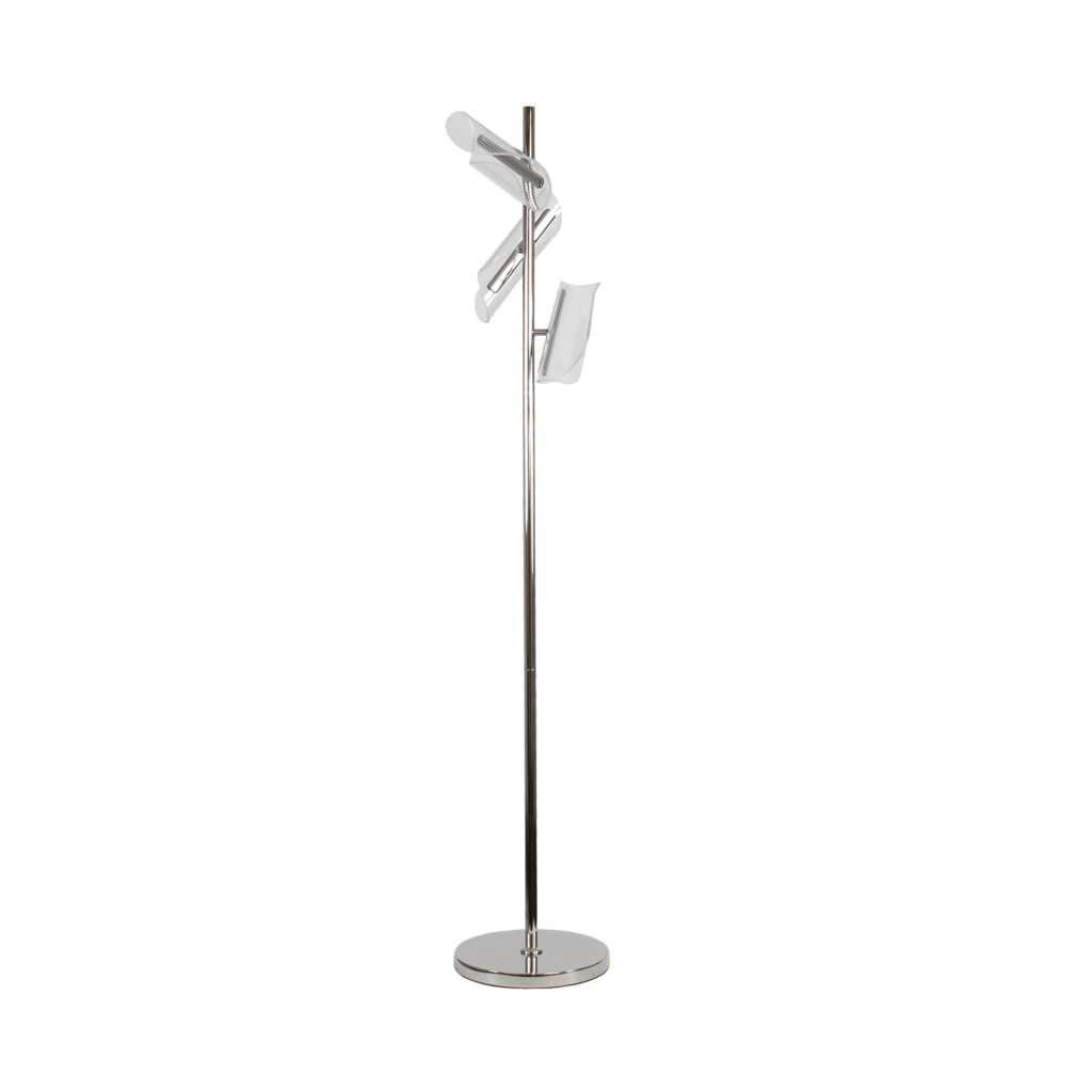[0] => The Isle Floor Lamp is sculptural and contemporary, with a bright nickel base and stem and clear curved shades. Its integrated LEDs provide a warm 2700K light, which brings an inviting glow into any living space.