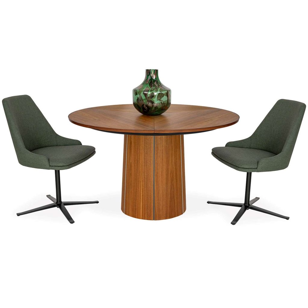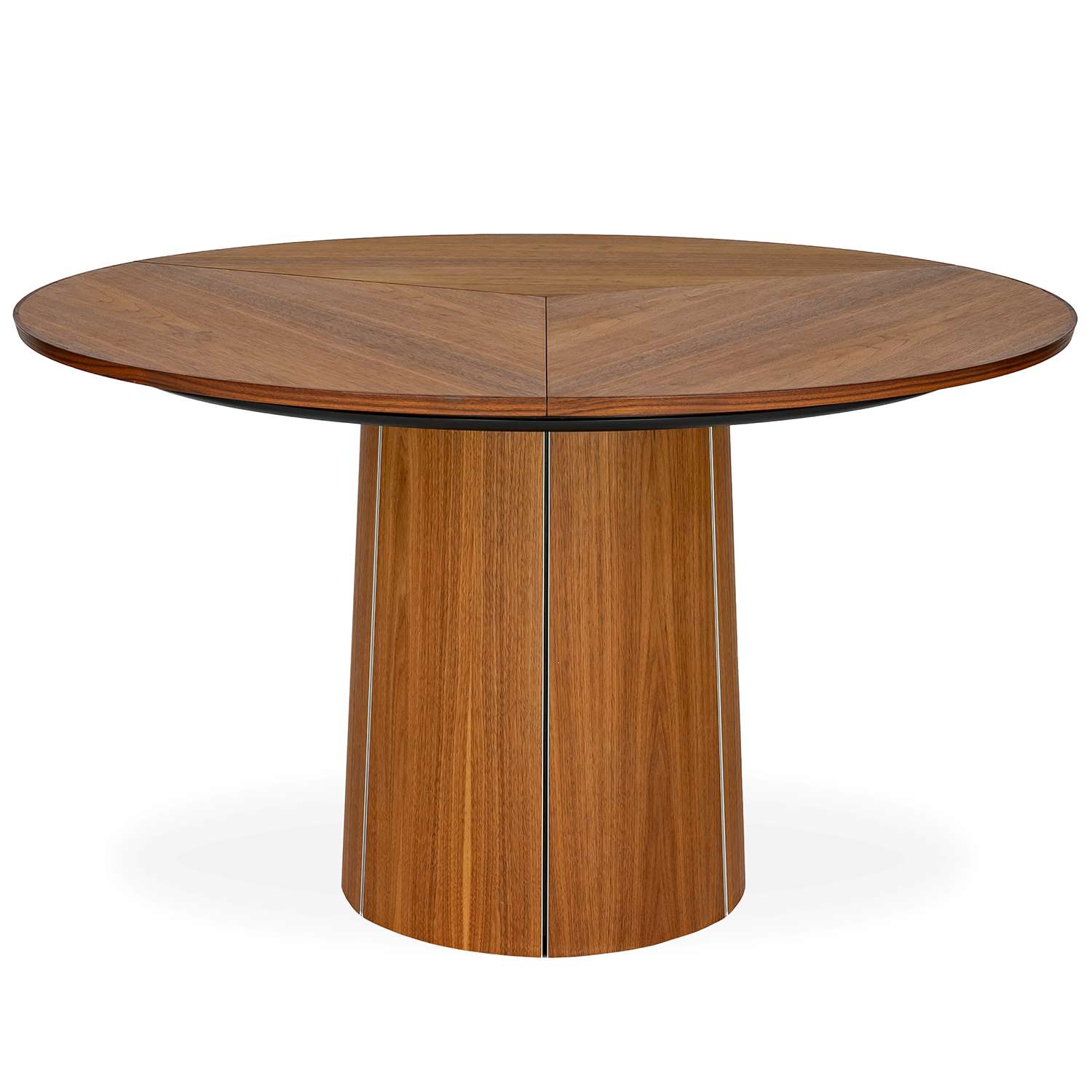 [0] => The Jones dining table by Skovby of Denmark, available with an oiled walnut top, is a beautiful contemporary dining table with clean lines and superior craftsmanship. The Jones seats six to nine people when fully extended. Simply turn the plate under the top and watch as it separates to reveal the self-storing leaves, which unfold with a light touch thanks to an innovative spring mechanism placed in the center of the base.