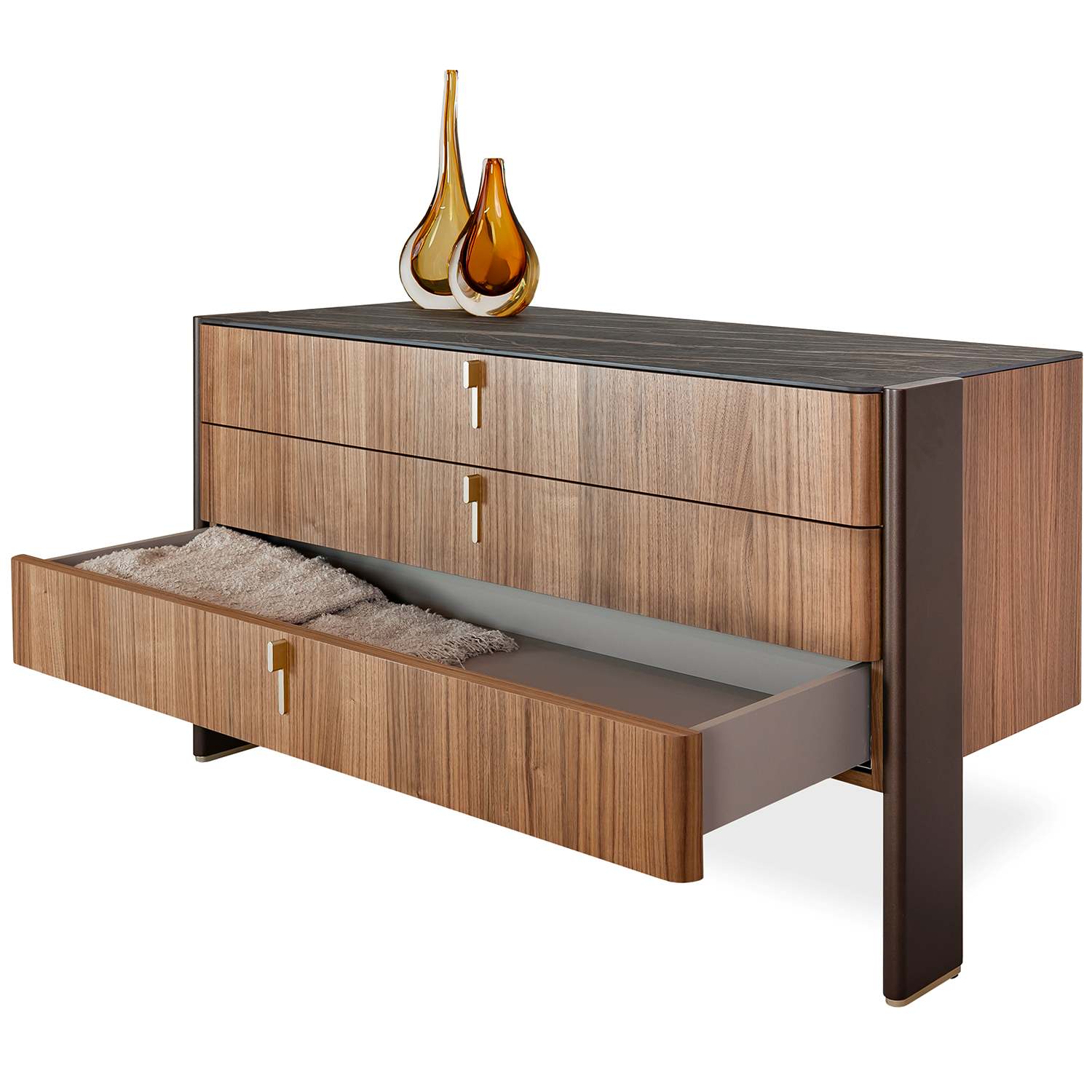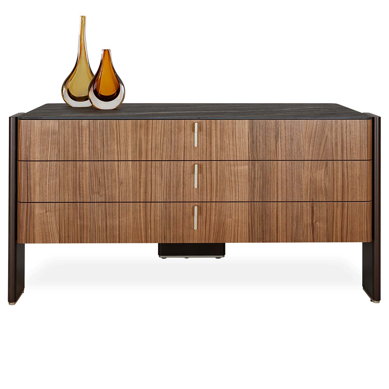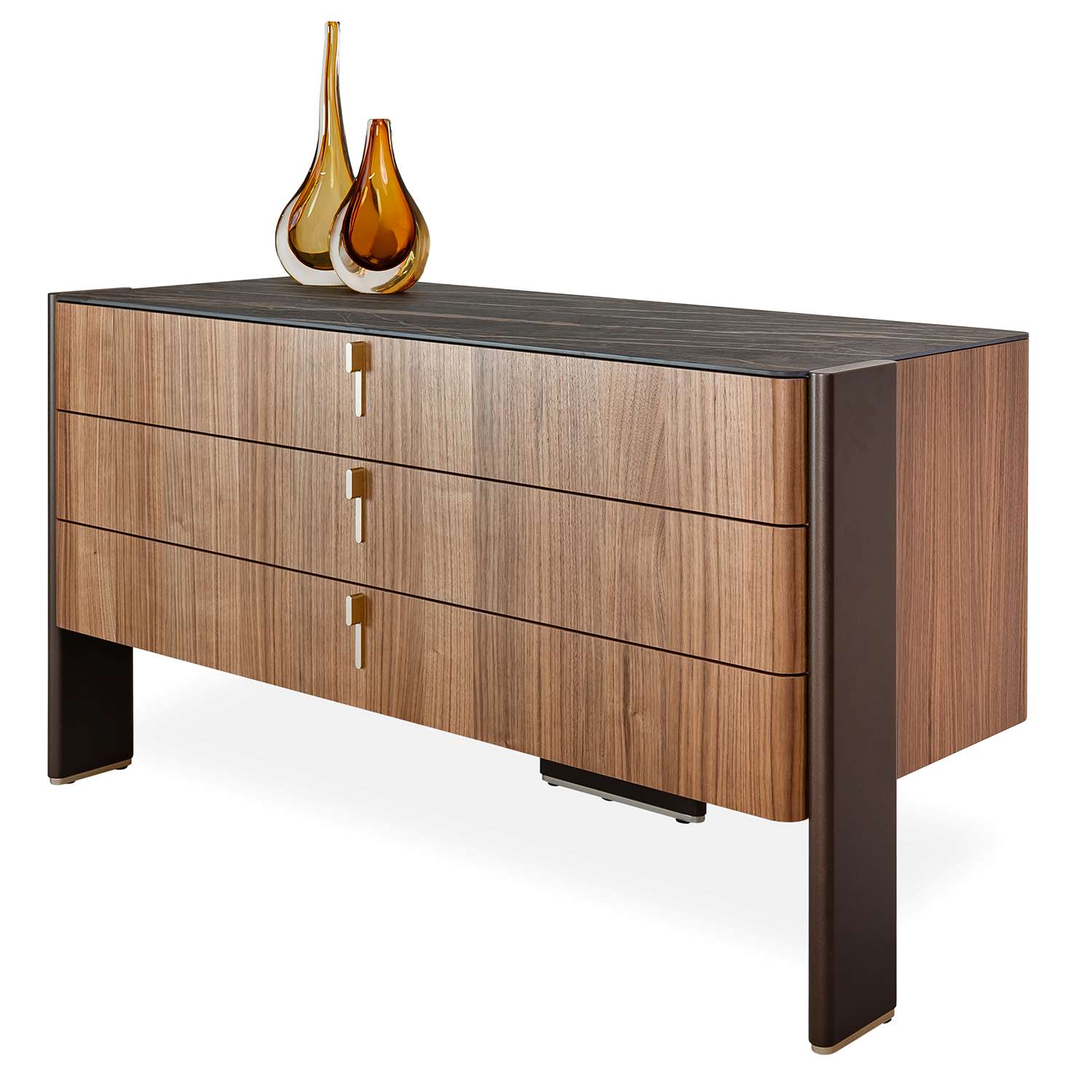 The Julian Dresser gracefully blends premium materials with sophisticated lines. Designed by Cattelan Italia, Julian is made with Canaletto walnut wood that beautifully complements the dark grey and brown striations of the ceramic marble top. Three legs made of bronze-lacquered wood flank the body all the way up to the tabletop, with a unique look created by a back leg that is wider than the side legs. Drawer pulls and leg bases made from steel with a brass-lacquered finish add another layer of style. Julian has a compact footprint with three spacious soft-close drawers that offer an elegant home for clothing and accessories.