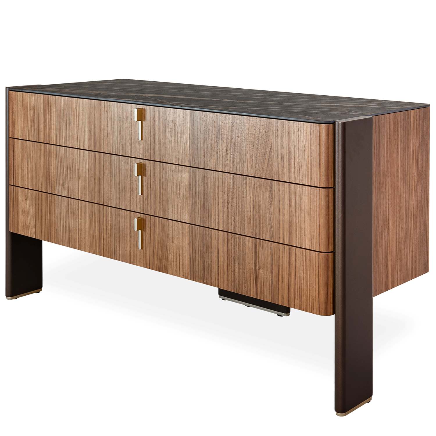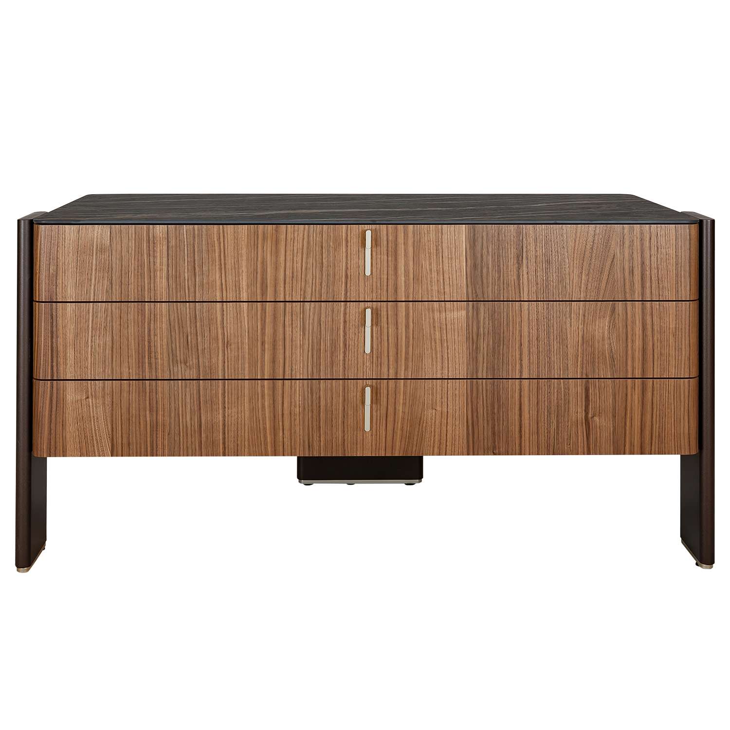 [0] => julian dresser with 3 drawers in canaletto walnut, legs bronze gf18, top in marmi matt portoro km07