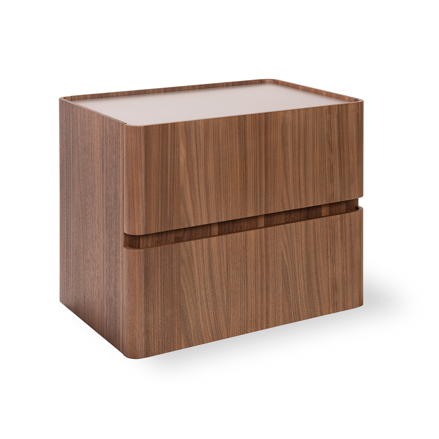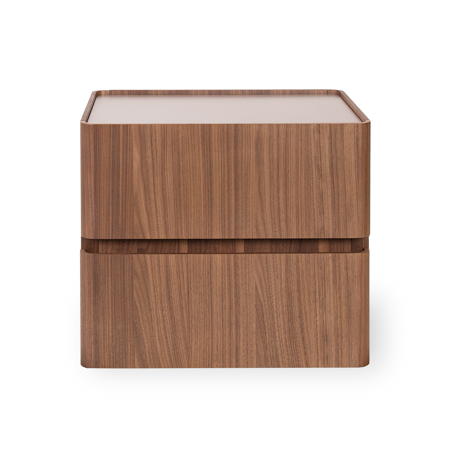 [0] => The Julian Nightstand is contemporary and streamlined, with a walnut finish, grey matte top, and two drawers for convenient storage of anything you need to keep close at hand. The top of the nightstand has a small ridge to prevent items from rolling off, and the drawers have integrated pulls for easy access.