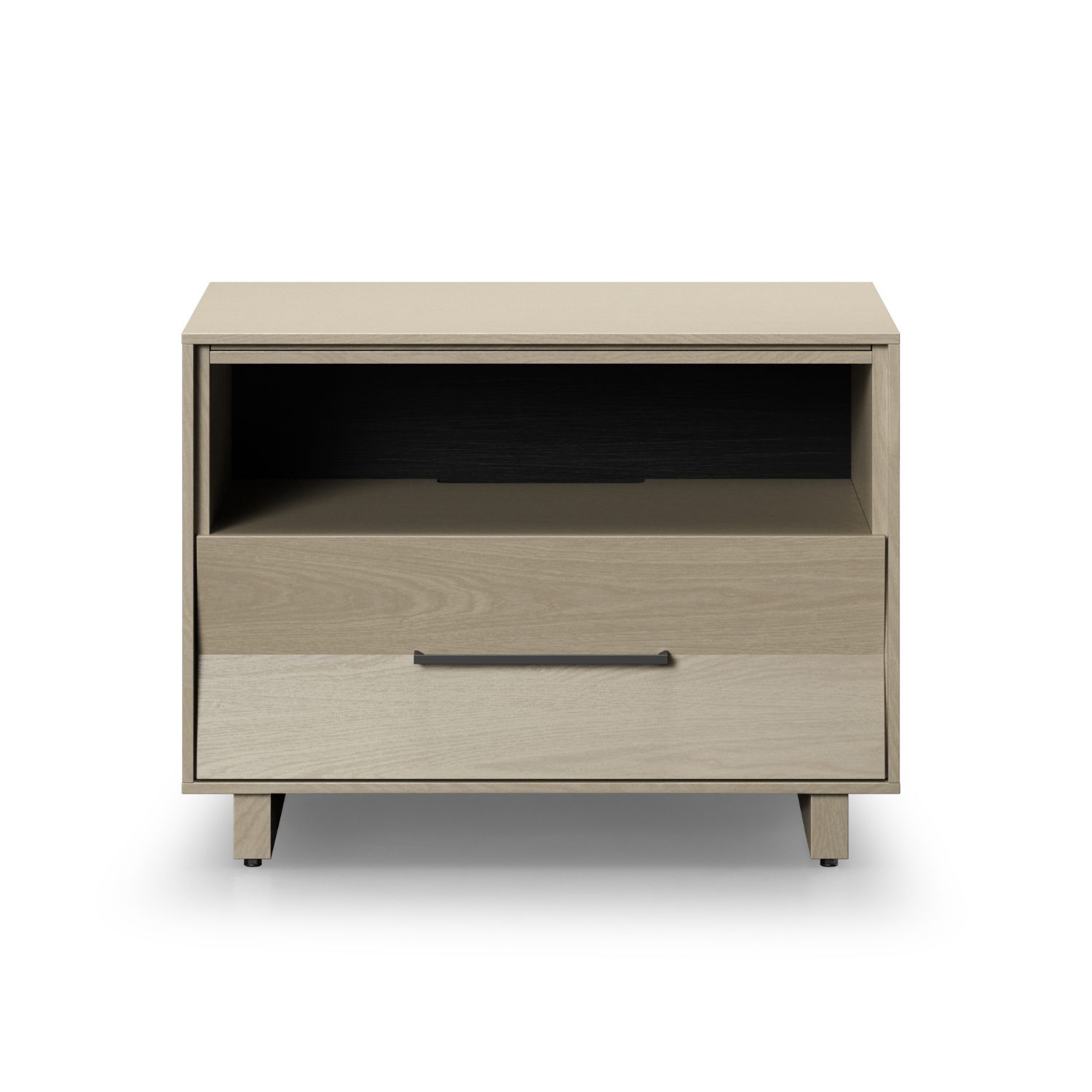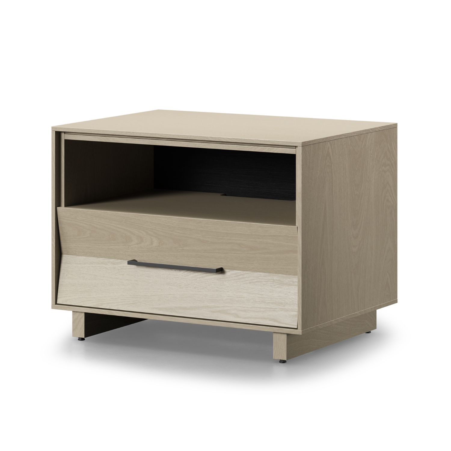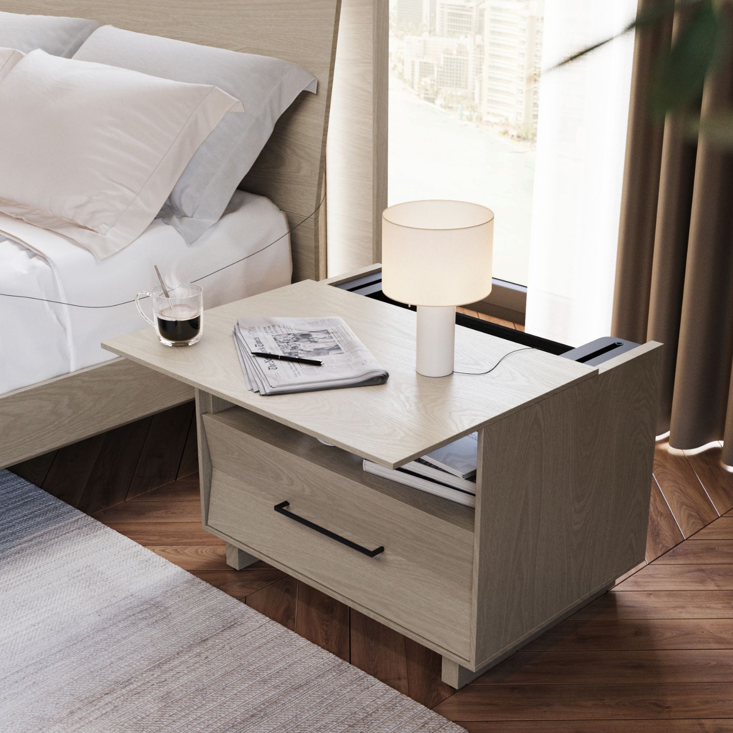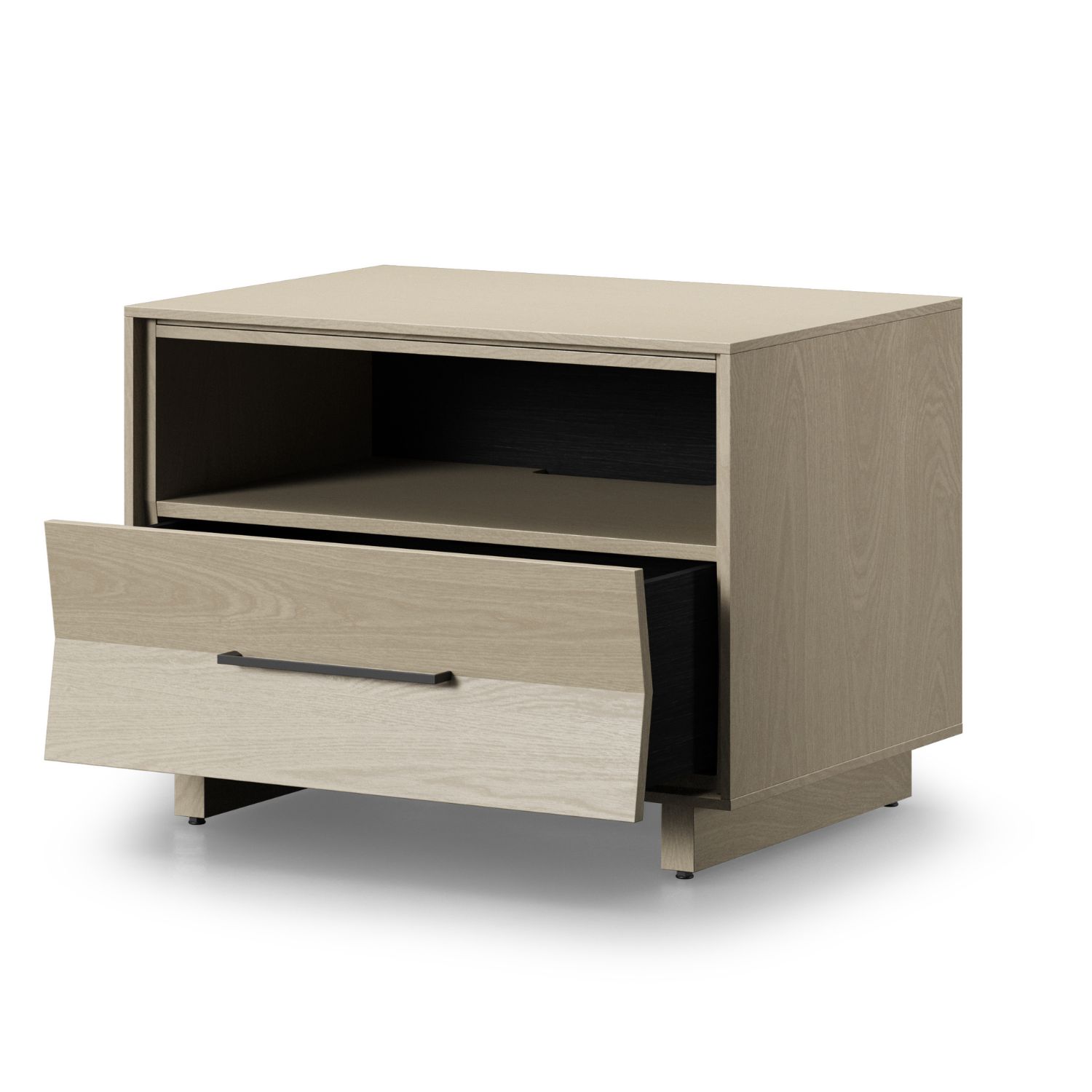 Designed by Matthew Weatherly, the Kava 28" Side Table features a washed oak veneer, a pleated drawer front, and the ability to function as either a nightstand or side table. Kava's state-of-the-art tabletop can slide forward, keeping items within easy reach by a bedside, or allowing access to an integrated power station on the back. Plug your lamp, clock, or chargers into the power strip, and keep cables organized with built-in wire wraps. An open compartment offers the perfect spot to put books and devices, while a soft-close drawer with a removable accessory tray stores your belongings in style. Pair the Kava 28" Side Table with other Kava items for a beautifully streamlined home.