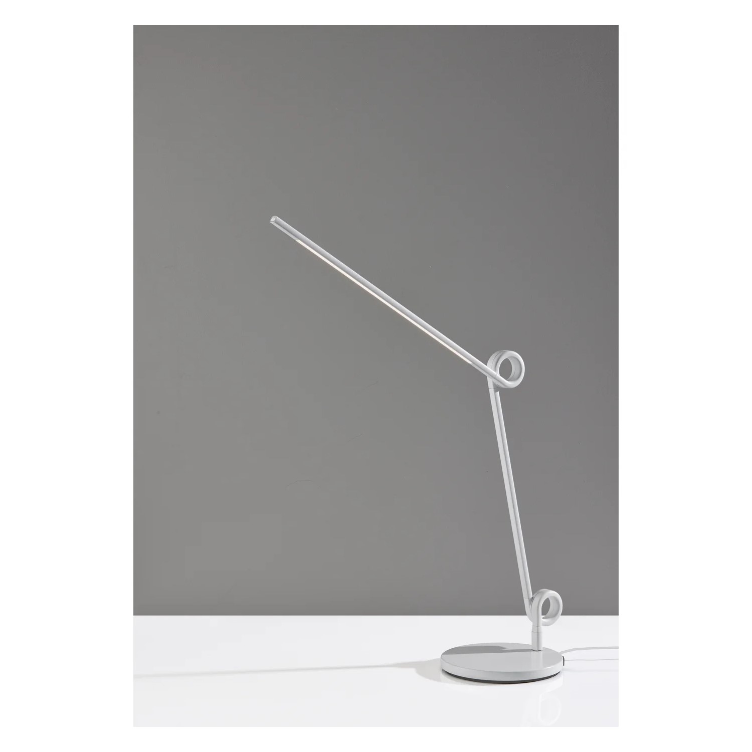 [0] => Bring high functionality and elegant modern style to your office with the Knot LED Desk Lamp. Made of white metal, this lamp creates an instant impression with its ultra-slim frame featuring two loops that mark places where you can adjust the height and direction of the lamp. Knot's integrated LED strip emits 650 lumens of light at a warm 3000K color temperature to ensure you have adequate illumination for your workspace, while a 4-way touch switch lets you find your perfect brightness level. Available with a white fabric-covered cord, the Knot Desk Lamp also features USB and USB-C ports in its base for easy charging of your devices.