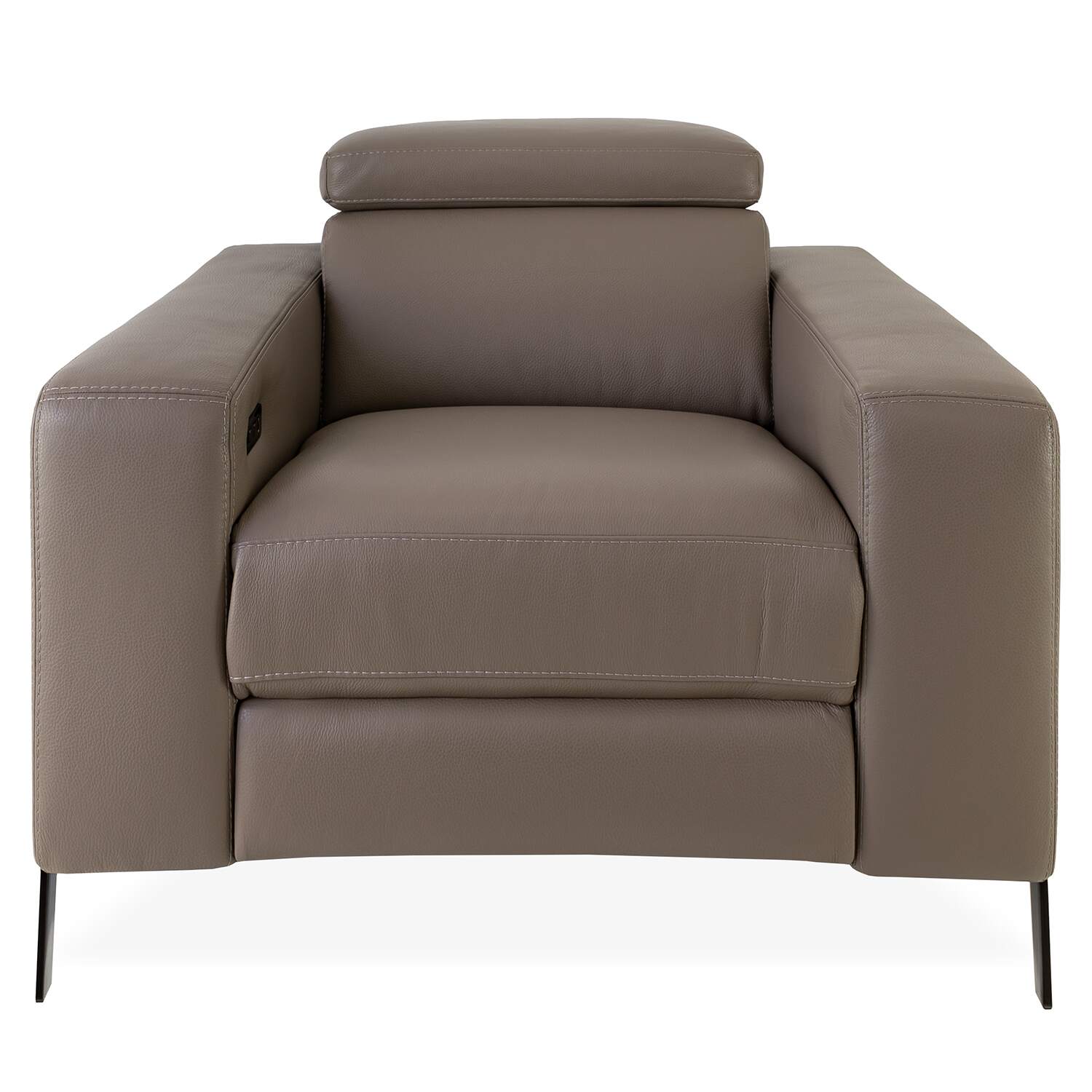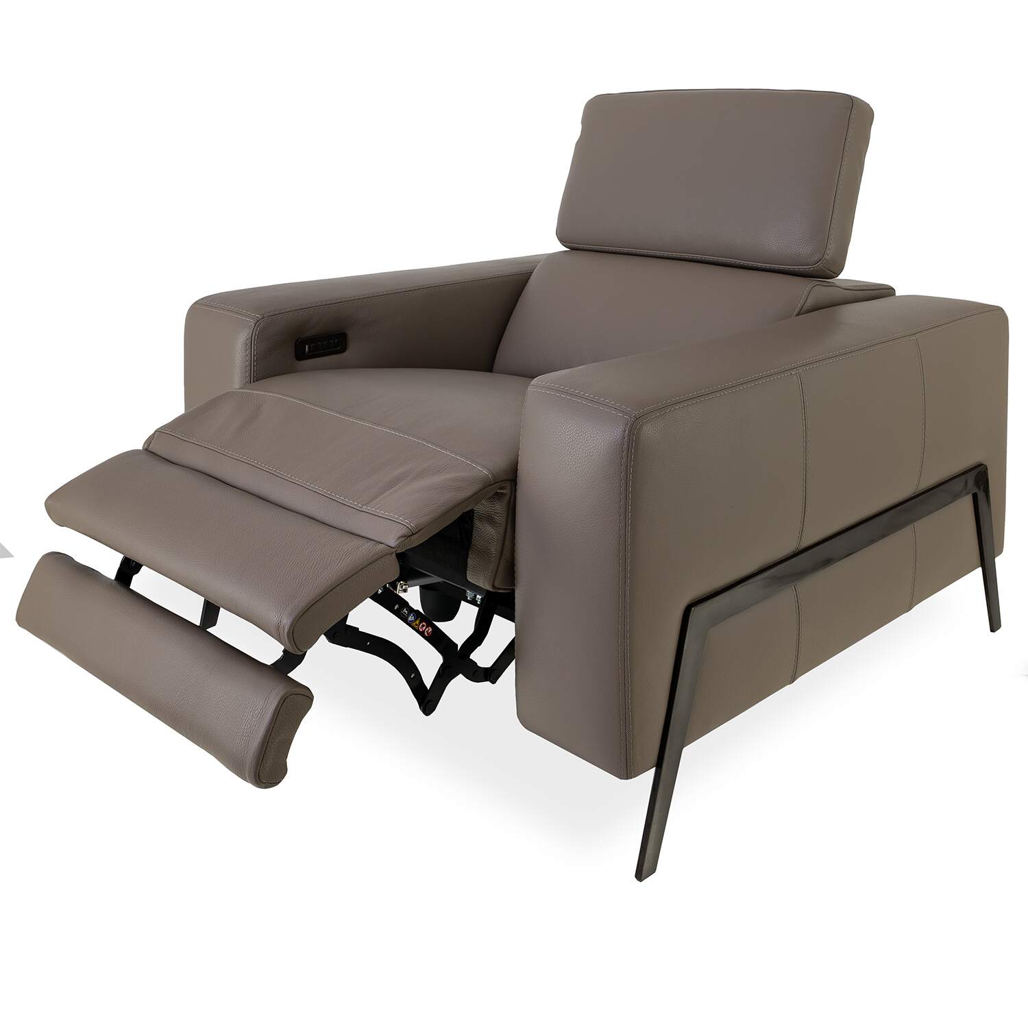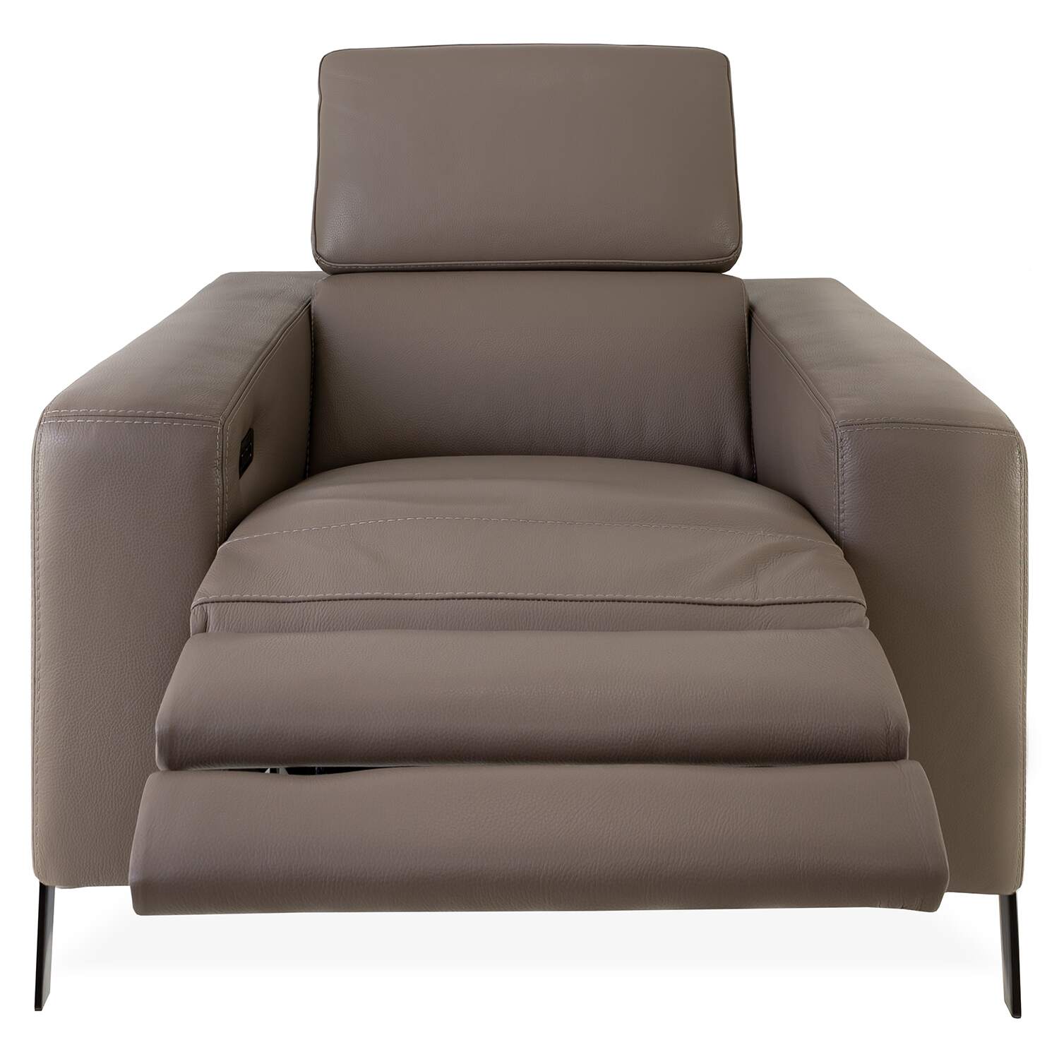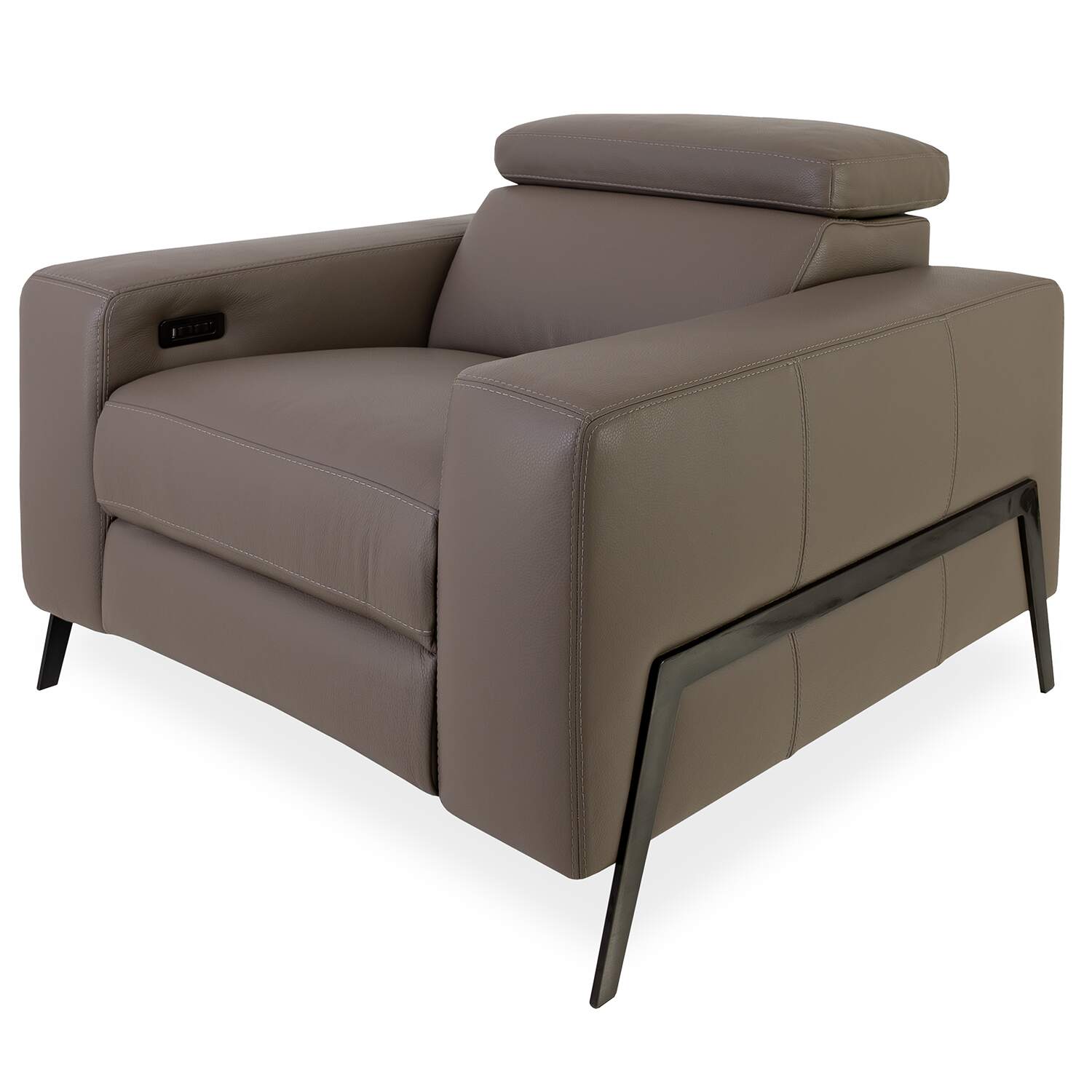 The Lando Chair, made in Italy, features power motion controls that bring you instant, custom comfort at the touch of a button. The spacious seat is surrounded by a thick frame with wide armrests, and taupe leather upholstery complements the smoke grey metal legs.