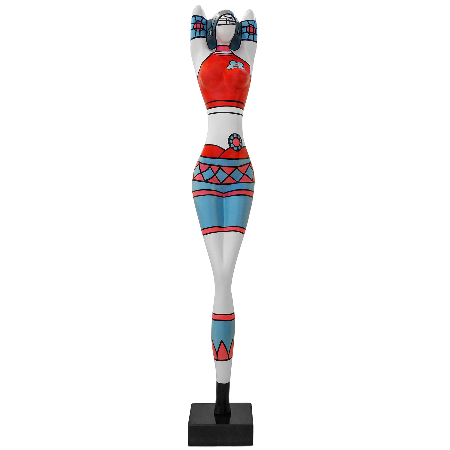 [0] => The Le Parisien Sculpture represents grace and high style, with the figure standing in a smoothly elegant pose. Her blue and red outfit accentuates the different curves and angles of the body, allowing one to visually trace their flow through her stretched pose. The piece can complement any space, and allows the owner to add a hint of color in a subtle way.