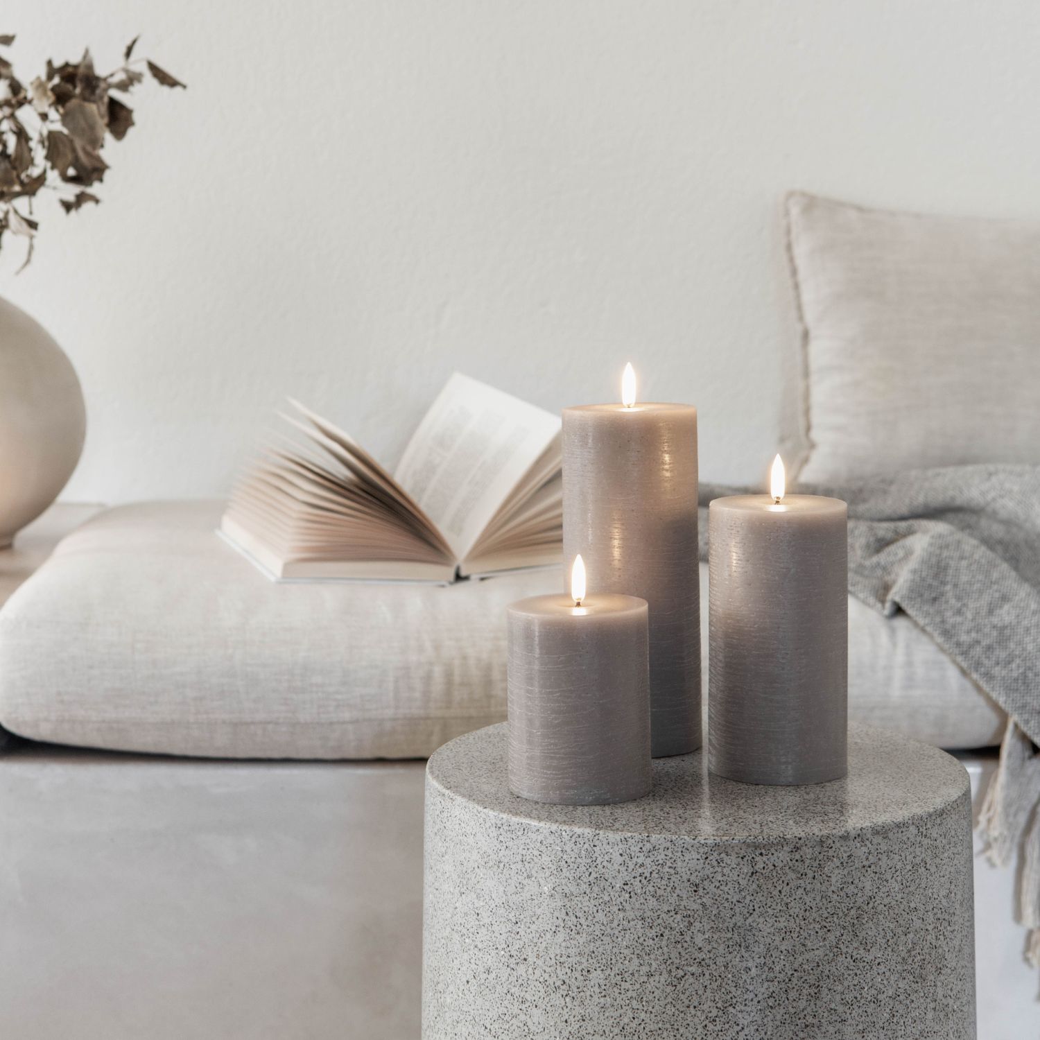 This LED pillar candle brings you warm, ambient light with a simple, rustic look and realistic melt-pool effect. Crafted with a sandstone paraffin finish, its rustic-textured wax adds a natural, handcrafted character for a more authentic feel. The realistic melt-pool design enhances the illusion of a freshly lit candle, while Uyuni's Signature Flicker™ LED creates a soothing, flame-free ambience filled with a homey charm. This candle works well on mantels, dining tables, consoles, or side tables, and pairs well with other Uyuni pillar sizes for a layered display.