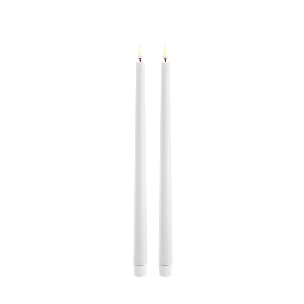 This set of 2 LED slim taper candles brings you elegant, ambient light with a clean, refined look. Crafted with a smooth virgin paraffin wax finish in Nordic white, these candles exude a crisp, polished feel suited for both formal and relaxed settings. They use Uyuni's Signature Flicker™ LED to create a soothing, flame-free ambience filled with a homey charm -- perfect for dining tables, console surfaces, mantelpieces, or paired in candleholders.