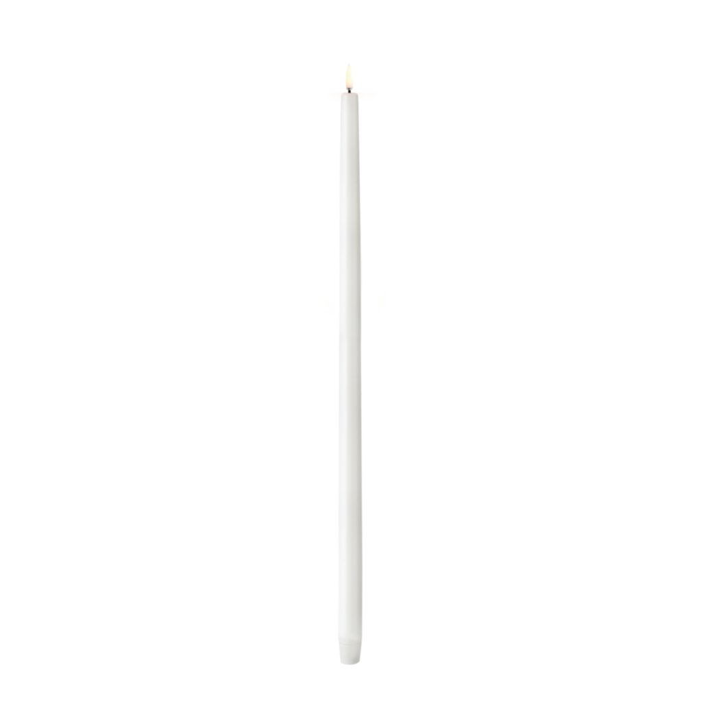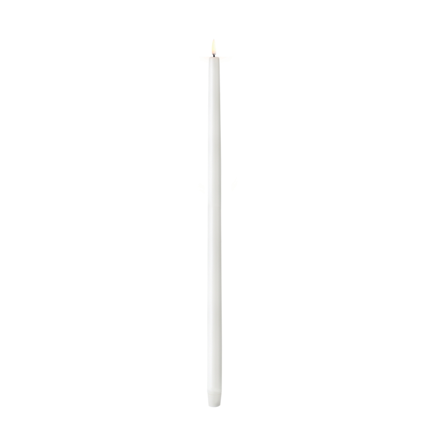 This LED tall taper candle brings you elegant, ambient light with a clean, refined look. Crafted with a smooth virgin paraffin wax finish in Nordic white, this candle exudes a crisp, polished feel suited for both formal and relaxed settings. It uses Uyuni's Signature Flicker™ LED to create a soothing, flame-free ambience filled with a homey charm -- perfect for dining tables, console surfaces, mantelpieces, or paired in candleholders.