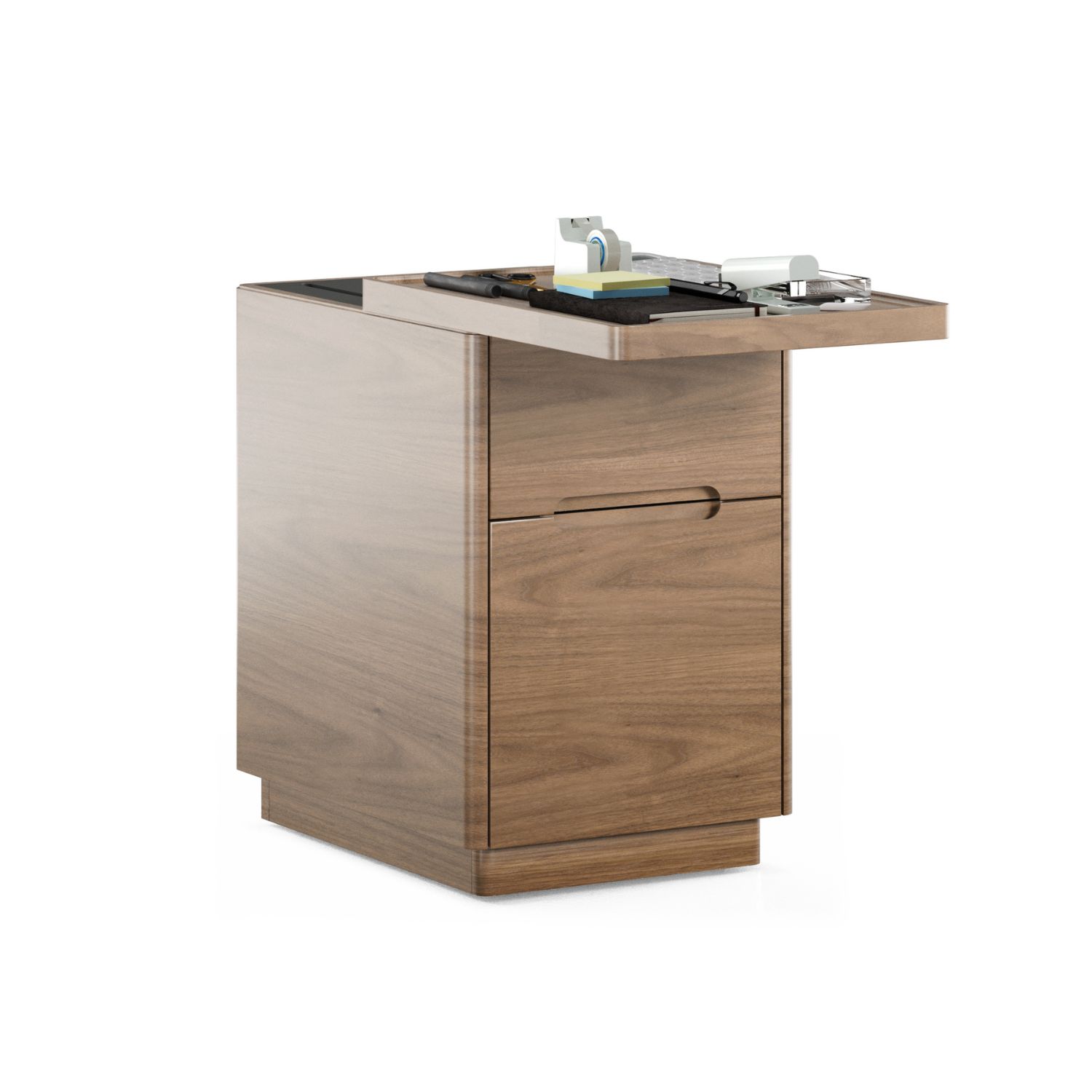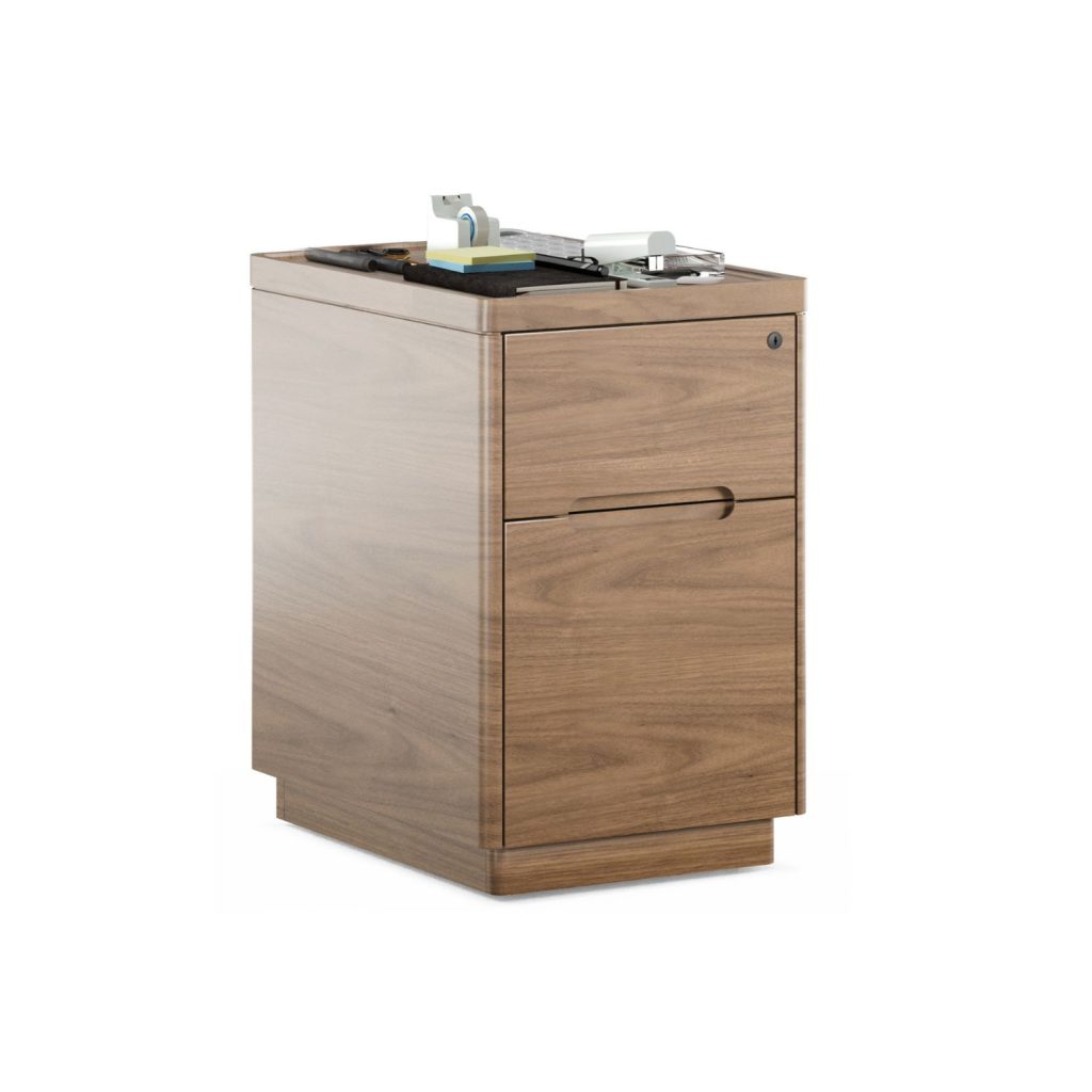 A compact companion for any Luma Desk, the Luma File Pedestal elevates your workday with refined, minimalist style and functional features. Luma boasts a sliding wood top panel that lets office supplies stay within easy reach, while its two lockable drawers keep files and documents secure. Available in natural walnut, Luma's rounded edges echo the lines of the Luma Desk, and its finished back panel lets it look elegant at any angle.