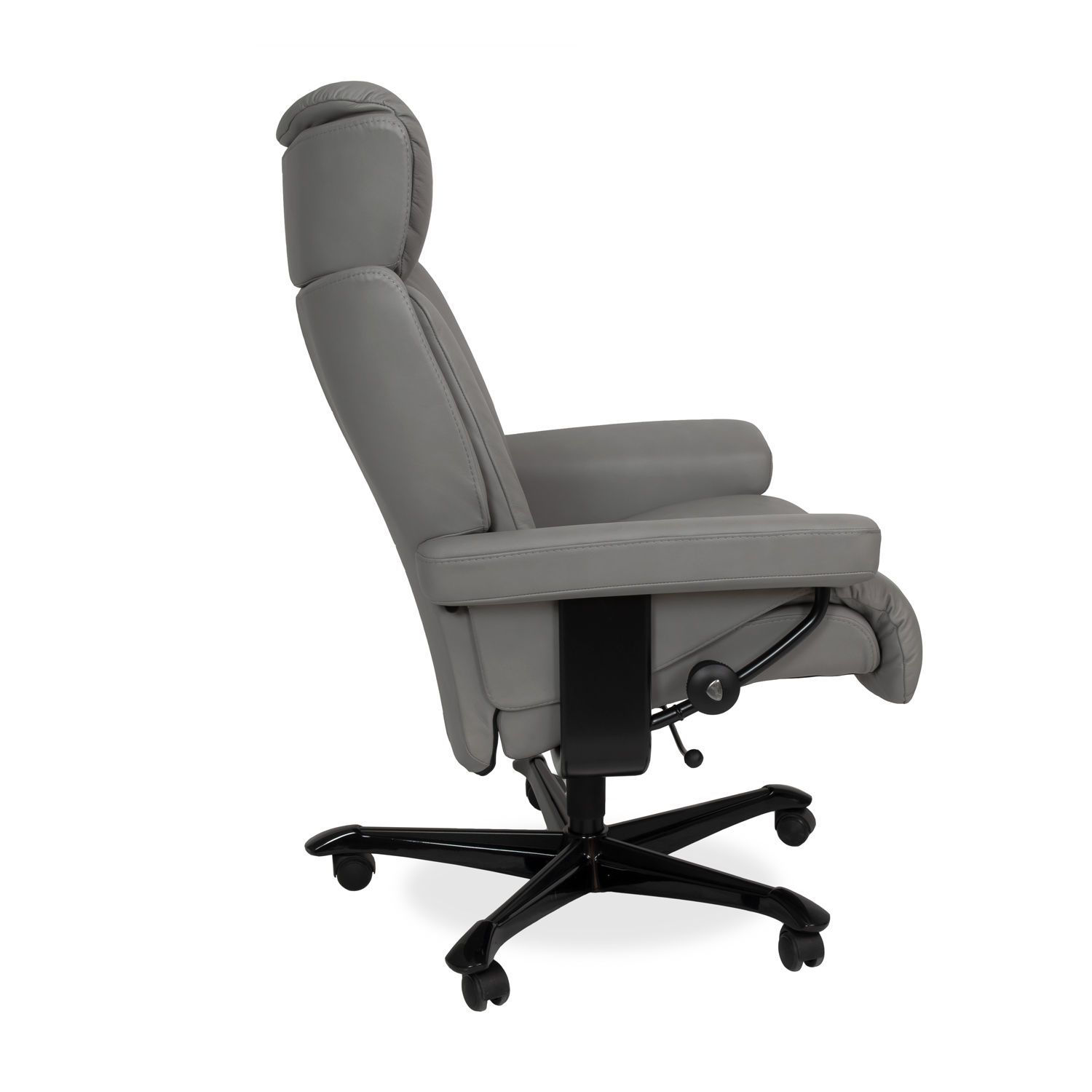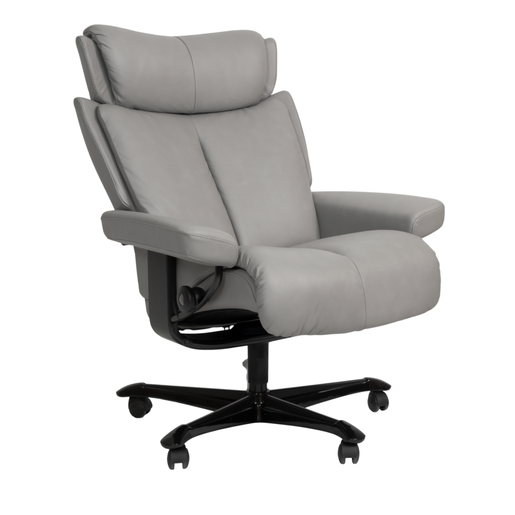 The Magic Office Chair, designed by Stressless® of Norway, has been engineered for comfort, with a seat and back designed to envelop and support your body. Magic features cutting-edge Stressless® technology, including the patented Plus™ and Glide systems, which allow the chair to provide continuous support for the head and lower back, while also adjusting the reclining angle based on shifts of the body. Available with a black base and casters and soft silver grey Paloma leather, Magic will bring comfort and style to any office space.
