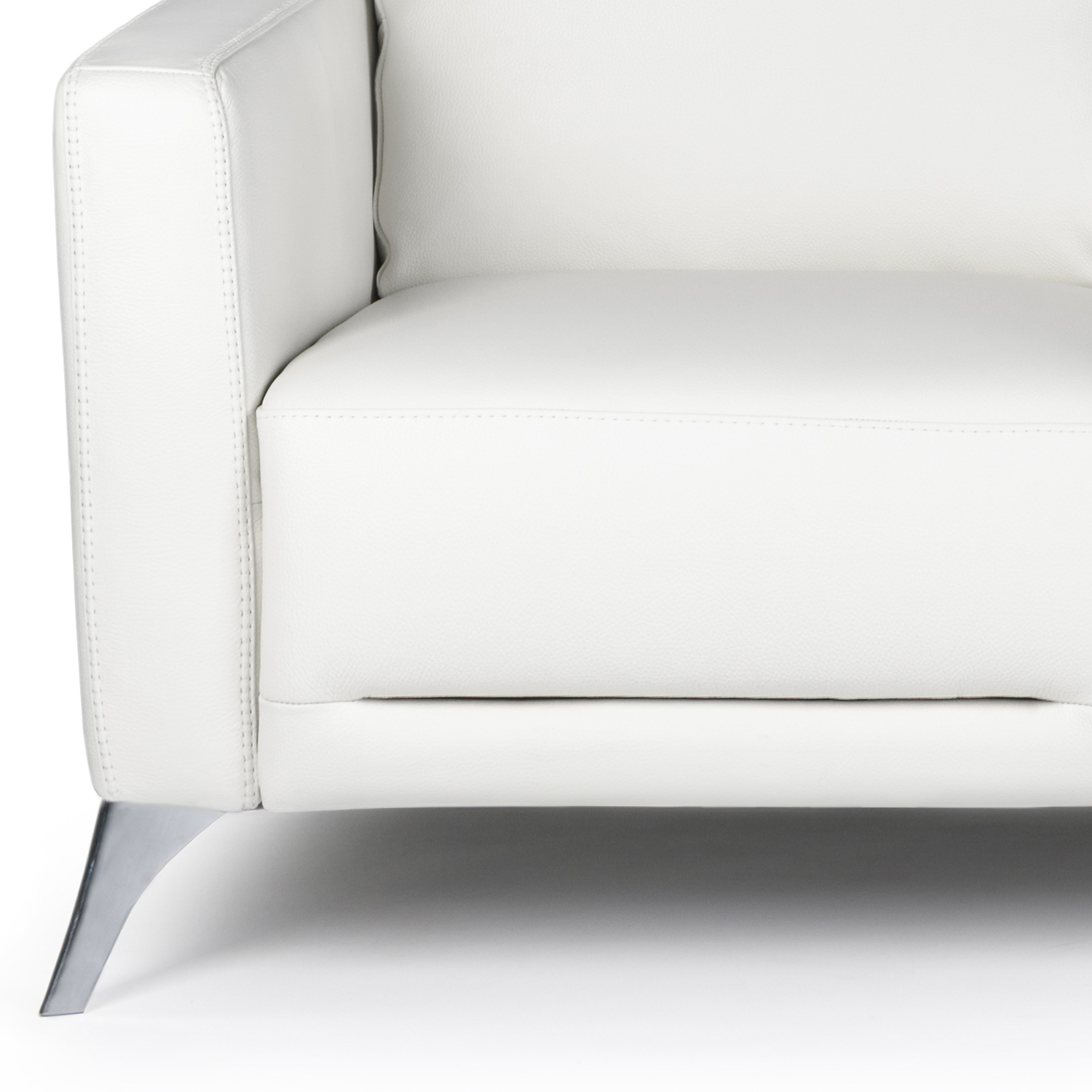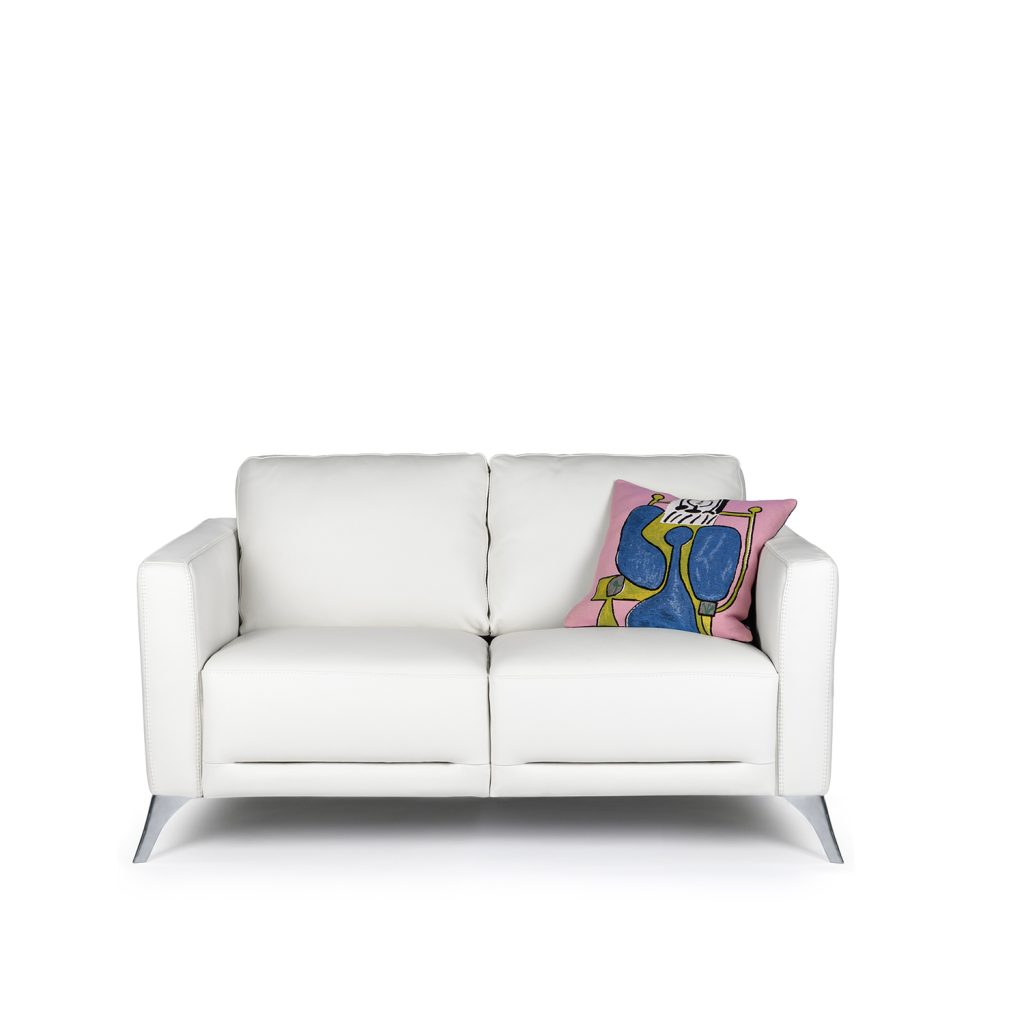 [0] => The Mala Loveseat, available with white leather upholstery and angled chrome legs, features modern Italian design and classic comfort. The leather has a soft, warm texture that is complemented by the matching box stitching. The rounded geometric lines of the seats and back contrast attractively with the bold horizontal lines at the base of the loveseat, emphasizing the wide, low profile of the seats.