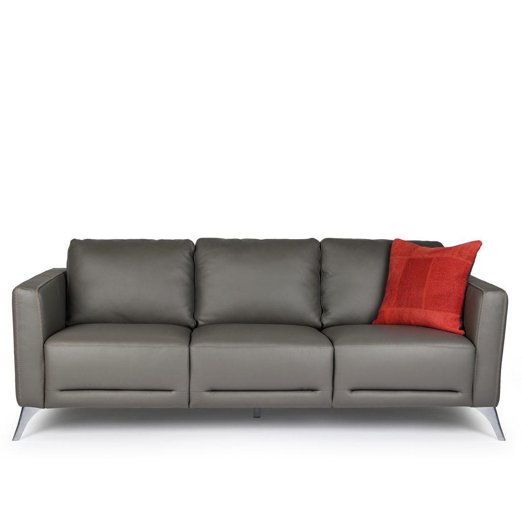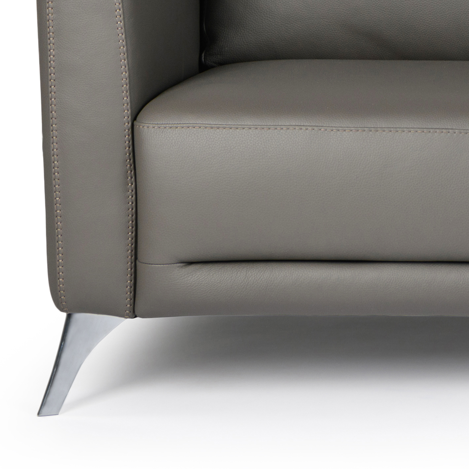[0] => The Mala Sofa, available with dark grey leather upholstery and angled chrome legs, features modern Italian design and classic comfort. The leather has a soft, warm texture that is complemented by the matching box stitching. The rounded geometric lines of the seats and back contrast attractively with the bold horizontal lines at the base of the sofa, emphasizing the wide, low profile of the seats.