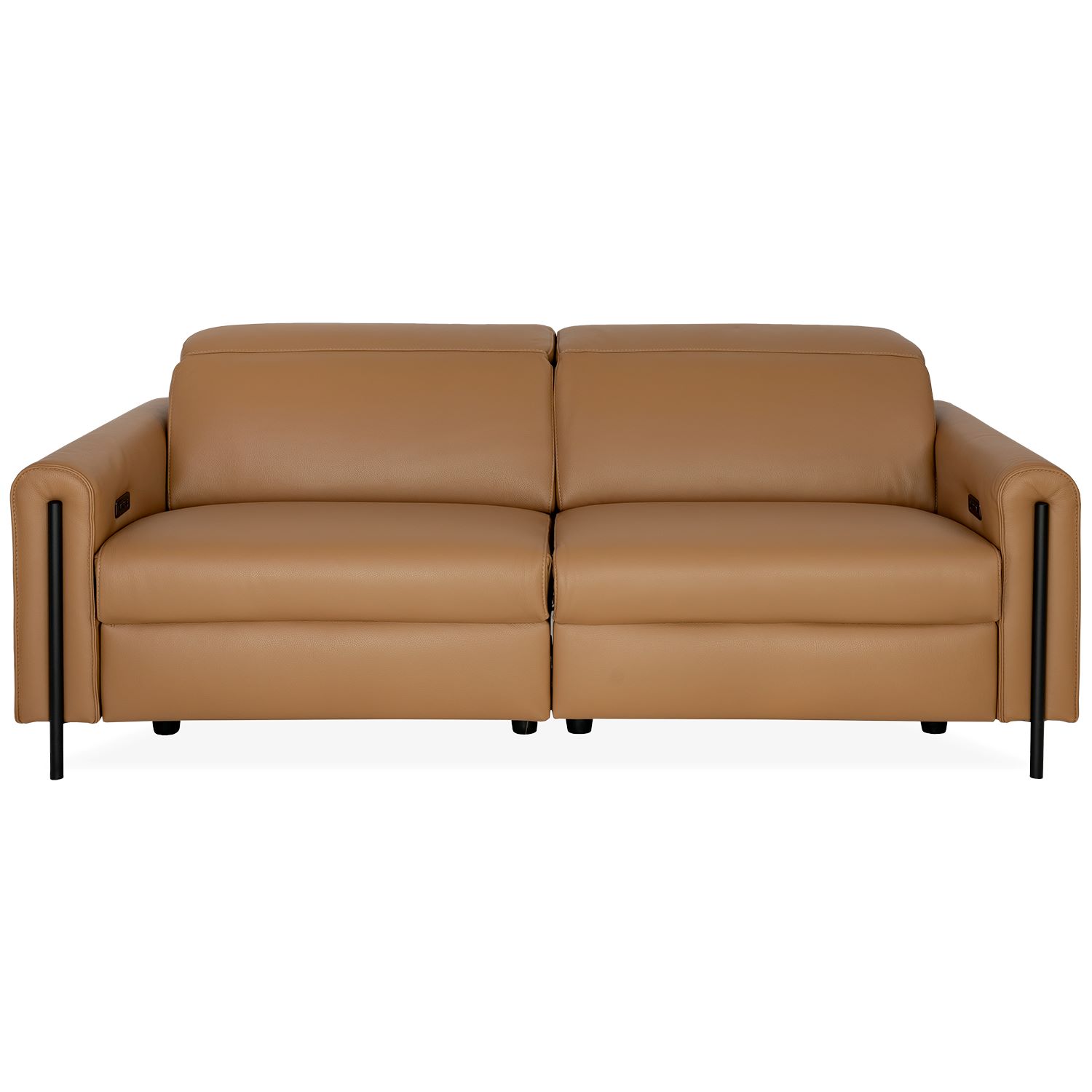 The Marcella Power Sofa is a powerhouse of comfort, style, and luxury. Crafted in Italy, this sofa features smooth, top-grain caramel Giotto leather, a black metal base, and black metal trim accents on the arms. Discreet buttons on the inside of each arm allow you to adjust the headrest and leg rest of each seat, reclining to a position of perfect comfort. Elevate your living space with Marcella's elegant design and enjoy a new level of relaxation.