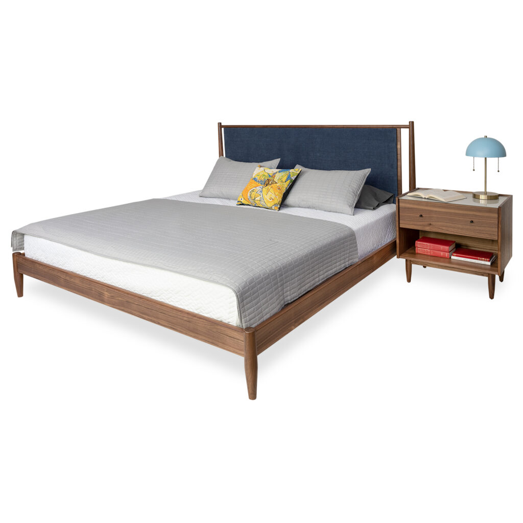 [0] => Designed by Joel Dupras, the Marvin Upholstered Queen Bed features a natural light walnut veneer and a headboard covered in blue Club fabric for a strong silhouette with a cozy feel. The round tapered shape of the bedposts is echoed in the lines of the legs, while open spaces framing the headboard add a touch of lightness. Constructed fully of wood with panel support, Marvin's classic look makes it a versatile choice for both traditional and contemporary bedrooms.